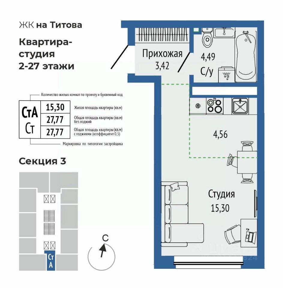 продам 1-к, Титова, 19.1 стр.4 618 338 ₽