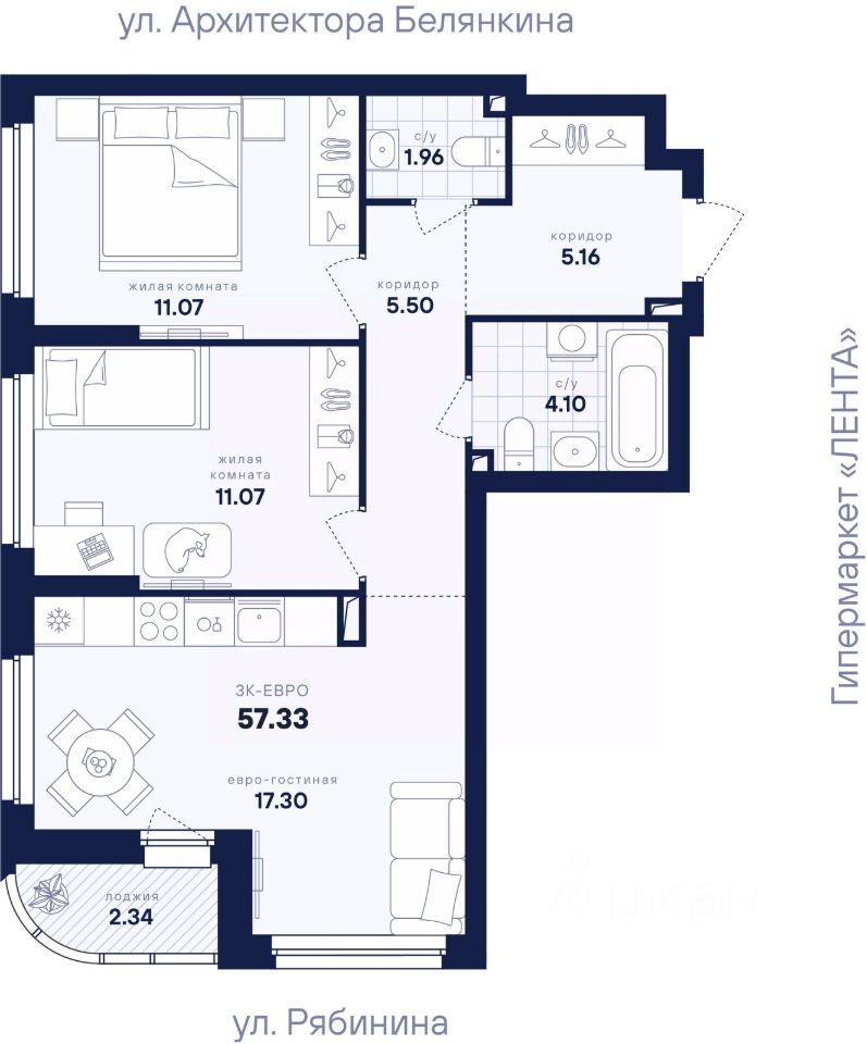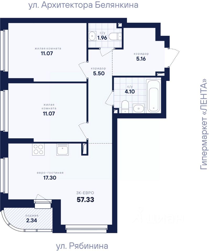Общая площадь57,33 м2