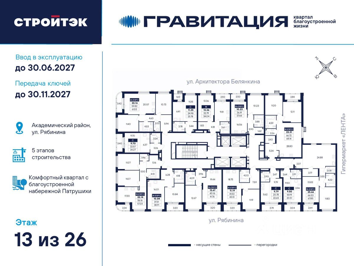 Удачные решения Новый квартал благоустроенной жизни ''Гравитация'' мы разместили в периметре улиц Рябинина и Академика Ландау. У квартала 5 этапов строительства, а всю работу мы завершим к 2030 году. Авторы проекта гармонично совместили в оформлении природные элементы и современный дизайн. Волнообразные очертания на стенах вдохновлены силой ветра и движением воды. Скруглённые углы подчеркивают элегантный силуэт, а контрастная палитра акцентов и контурная подсветка верхних этажей создают выразительный архитектурный образ. Первый этап строительства: — Секция 1.1 — 1 подъезд 26 этажей — Секция 1.2 — 2 подъезда 16 этажей — Секция 1.3 — 1 подъезд 12 этажей Здесь всё и сразу Гравитация — уютный и обособленный, и в то же время открытый и просторный квартал. Всё рядом: супермаркеты и парки, кино и рестораны, школы и сады. В нескольких шагах набережная реки Патрушихи. В квартале построят муниципальный детский сад на 200 мест, а на 5 этапе строительства мы возведём 6-уровневый надземный паркинг на 250 машин. На первых этажах домов для вас будет работать торговая галерея с магазинами, кафе и привычными бытовыми сервисами. В 1 этапе строительства 631 квартира. Своя вселенная Развитый Академический район удобен и молодым семьям, и школьникам, и состоявшимся профессионалам. Рядом большой Преображенский парк с озером и Юго-Западный лесопарк с Тропой здоровья. — 3 минуты до Гипер Ленты — 10 минут на машине до ТРЦ ''Академический'', 15 минут до ЕКАД, 25 до центра — 6 школ и 6 детских садов — Спортивные комплексы и клубы Wake up, Bright Fit и Юность Богатые возможности В квартале два просторных закрытых двора общей площадью 1,4 гектара. Один двор объединяет 1 и 2 этапы строительства, другой — 3, 4 и 5 этапы. Между дворами — камерная прогулочная аллея для неспешных вечеров или полуденного отдыха. Во дворе первого этапа — зелёные участки из хвойных деревьев, акцентных кустарников и травянистых многолетников, а также сеть дорожек, детская площадка с песочницей, аттракционами и геопластикой, настольный теннис и зона для зарядки. А для комфорта и безопасности — вечернее освещение, охрана и постоянное видеонаблюдение. Пространство с заботой В просторных светлых лобби Гравитации — интеллигентный дизайн, помещения для колясок, высокие витражи и комфортная мебель. Выходы сквозные, на улицу и во двор. Лифты грузоподъёмностью 1000 и 450 кг. Мы подготовили для вас 44 уникальных варианта продуманных планировок, в том числе с кухнями-гостиными, гардеробными и мастер-спальнями. Здесь нет бесполезных зон, зато есть где посидеть в семейном кругу и разместить всё для удобства и комфорта. Современные технологии Мы позаботились о достойной чистовой отделке, чтобы вы могли уделить время главному. — Виниловые обои на флизелиновой основе, окрашенные стены в санузлах и на лоджиях — Натяжные потолки везде, кроме лоджий, там — окрашенные — Прочный влагостойкий ламинат и керамическая плитка — Межкомнатные двери светлых тонов и сейф-дверь на входе — Эргономичное размещение розеток и выключателей