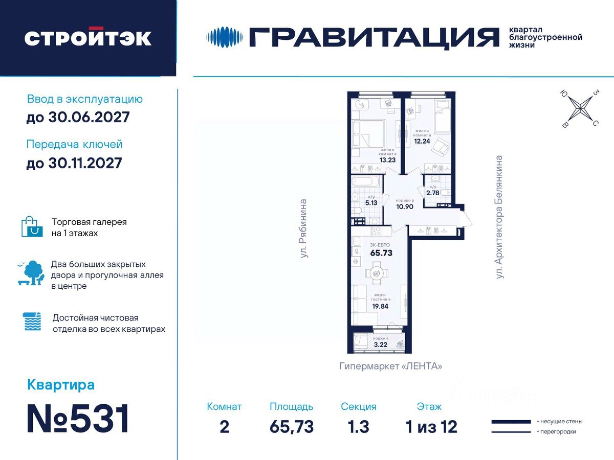 Удачные решения Новый квартал благоустроенной жизни ''Гравитация'' мы разместили в периметре улиц Рябинина и Академика Ландау. У квартала 5 этапов строительства, а всю работу мы завершим к 2030 году. Авторы проекта гармонично совместили в оформлении природные элементы и современный дизайн. Волнообразные очертания на стенах вдохновлены силой ветра и движением воды. Скруглённые углы подчеркивают элегантный силуэт, а контрастная палитра акцентов и контурная подсветка верхних этажей создают выразительный архитектурный образ. Первый этап строительства: — Секция 1.1 — 1 подъезд 26 этажей — Секция 1.2 — 2 подъезда 16 этажей — Секция 1.3 — 1 подъезд 12 этажей Здесь всё и сразу Гравитация — уютный и обособленный, и в то же время открытый и просторный квартал. Всё рядом: супермаркеты и парки, кино и рестораны, школы и сады. В нескольких шагах набережная реки Патрушихи. В квартале построят муниципальный детский сад на 200 мест, а на 5 этапе строительства мы возведём 6-уровневый надземный паркинг на 250 машин. На первых этажах домов для вас будет работать торговая галерея с магазинами, кафе и привычными бытовыми сервисами. В 1 этапе строительства 631 квартира. Своя вселенная Развитый Академический район удобен и молодым семьям, и школьникам, и состоявшимся профессионалам. Рядом большой Преображенский парк с озером и Юго-Западный лесопарк с Тропой здоровья. — 3 минуты до Гипер Ленты — 10 минут на машине до ТРЦ ''Академический'', 15 минут до ЕКАД, 25 до центра — 6 школ и 6 детских садов — Спортивные комплексы и клубы Wake up, Bright Fit и Юность Богатые возможности В квартале два просторных закрытых двора общей площадью 1,4 гектара. Один двор объединяет 1 и 2 этапы строительства, другой — 3, 4 и 5 этапы. Между дворами — камерная прогулочная аллея для неспешных вечеров или полуденного отдыха. Во дворе первого этапа — зелёные участки из хвойных деревьев, акцентных кустарников и травянистых многолетников, а также сеть дорожек, детская площадка с песочницей, аттракционами и геопластикой, настольный теннис и зона для зарядки. А для комфорта и безопасности — вечернее освещение, охрана и постоянное видеонаблюдение. Пространство с заботой В просторных светлых лобби Гравитации — интеллигентный дизайн, помещения для колясок, высокие витражи и комфортная мебель. Выходы сквозные, на улицу и во двор. Лифты грузоподъёмностью 1000 и 450 кг. Мы подготовили для вас 44 уникальных варианта продуманных планировок, в том числе с кухнями-гостиными, гардеробными и мастер-спальнями. Здесь нет бесполезных зон, зато есть где посидеть в семейном кругу и разместить всё для удобства и комфорта. Современные технологии Мы позаботились о достойной чистовой отделке, чтобы вы могли уделить время главному. — Виниловые обои на флизелиновой основе, окрашенные стены в санузлах и на лоджиях — Натяжные потолки везде, кроме лоджий, там — окрашенные — Прочный влагостойкий ламинат и керамическая плитка — Межкомнатные двери светлых тонов и сейф-дверь на входе — Эргономичное размещение розеток и выключателей