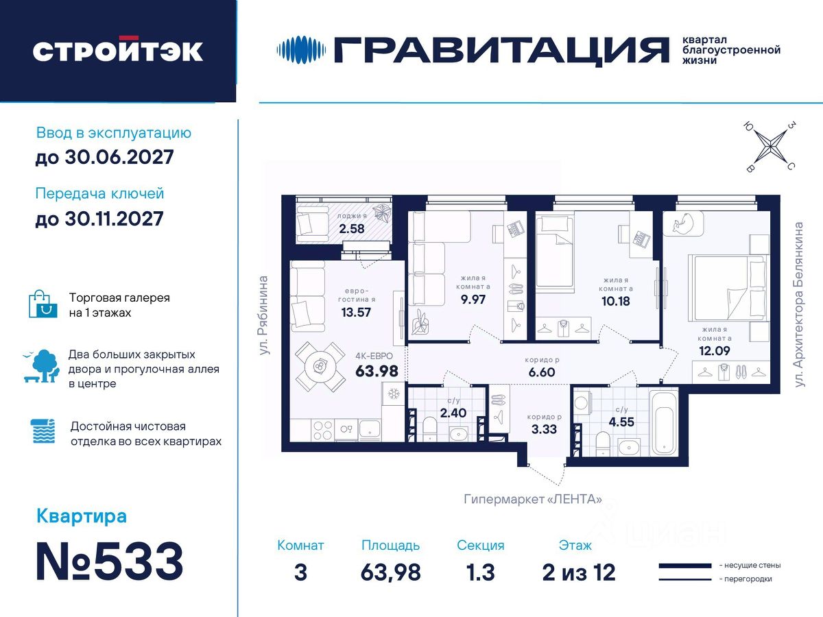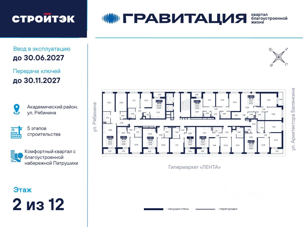 Удачные решения Новый квартал благоустроенной жизни ''Гравитация'' мы разместили в периметре улиц Рябинина и Академика Ландау. У квартала 5 этапов строительства, а всю работу мы завершим к 2030 году. Авторы проекта гармонично совместили в оформлении природные элементы и современный дизайн. Волнообразные очертания на стенах вдохновлены силой ветра и движением воды. Скруглённые углы подчеркивают элегантный силуэт, а контрастная палитра акцентов и контурная подсветка верхних этажей создают выразительный архитектурный образ. Первый этап строительства: — Секция 1.1 — 1 подъезд 26 этажей — Секция 1.2 — 2 подъезда 16 этажей — Секция 1.3 — 1 подъезд 12 этажей Здесь всё и сразу Гравитация — уютный и обособленный, и в то же время открытый и просторный квартал. Всё рядом: супермаркеты и парки, кино и рестораны, школы и сады. В нескольких шагах набережная реки Патрушихи. В квартале построят муниципальный детский сад на 200 мест, а на 5 этапе строительства мы возведём 6-уровневый надземный паркинг на 250 машин. На первых этажах домов для вас будет работать торговая галерея с магазинами, кафе и привычными бытовыми сервисами. В 1 этапе строительства 631 квартира. Своя вселенная Развитый Академический район удобен и молодым семьям, и школьникам, и состоявшимся профессионалам. Рядом большой Преображенский парк с озером и Юго-Западный лесопарк с Тропой здоровья. — 3 минуты до Гипер Ленты — 10 минут на машине до ТРЦ ''Академический'', 15 минут до ЕКАД, 25 до центра — 6 школ и 6 детских садов — Спортивные комплексы и клубы Wake up, Bright Fit и Юность Богатые возможности В квартале два просторных закрытых двора общей площадью 1,4 гектара. Один двор объединяет 1 и 2 этапы строительства, другой — 3, 4 и 5 этапы. Между дворами — камерная прогулочная аллея для неспешных вечеров или полуденного отдыха. Во дворе первого этапа — зелёные участки из хвойных деревьев, акцентных кустарников и травянистых многолетников, а также сеть дорожек, детская площадка с песочницей, аттракционами и геопластикой, настольный теннис и зона для зарядки. А для комфорта и безопасности — вечернее освещение, охрана и постоянное видеонаблюдение. Пространство с заботой В просторных светлых лобби Гравитации — интеллигентный дизайн, помещения для колясок, высокие витражи и комфортная мебель. Выходы сквозные, на улицу и во двор. Лифты грузоподъёмностью 1000 и 450 кг. Мы подготовили для вас 44 уникальных варианта продуманных планировок, в том числе с кухнями-гостиными, гардеробными и мастер-спальнями. Здесь нет бесполезных зон, зато есть где посидеть в семейном кругу и разместить всё для удобства и комфорта. Современные технологии Мы позаботились о достойной чистовой отделке, чтобы вы могли уделить время главному. — Виниловые обои на флизелиновой основе, окрашенные стены в санузлах и на лоджиях — Натяжные потолки везде, кроме лоджий, там — окрашенные — Прочный влагостойкий ламинат и керамическая плитка — Межкомнатные двери светлых тонов и сейф-дверь на входе — Эргономичное размещение розеток и выключателей