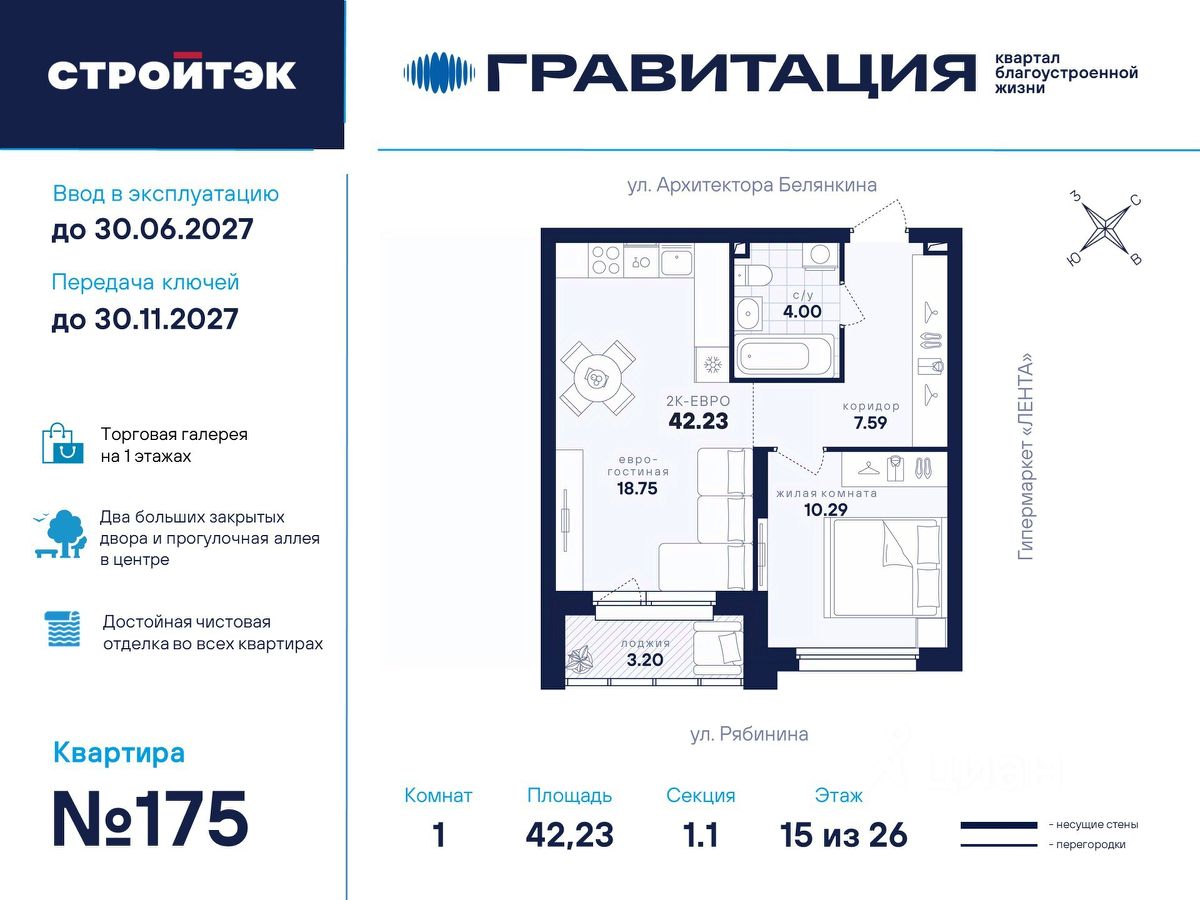 Удачные решения Новый квартал благоустроенной жизни ''Гравитация'' мы разместили в периметре улиц Рябинина и Академика Ландау. У квартала 5 этапов строительства, а всю работу мы завершим к 2030 году. Авторы проекта гармонично совместили в оформлении природные элементы и современный дизайн. Волнообразные очертания на стенах вдохновлены силой ветра и движением воды. Скруглённые углы подчеркивают элегантный силуэт, а контрастная палитра акцентов и контурная подсветка верхних этажей создают выразительный архитектурный образ. Первый этап строительства: — Секция 1.1 — 1 подъезд 26 этажей — Секция 1.2 — 2 подъезда 16 этажей — Секция 1.3 — 1 подъезд 12 этажей Здесь всё и сразу Гравитация — уютный и обособленный, и в то же время открытый и просторный квартал. Всё рядом: супермаркеты и парки, кино и рестораны, школы и сады. В нескольких шагах набережная реки Патрушихи. В квартале построят муниципальный детский сад на 200 мест, а на 5 этапе строительства мы возведём 6-уровневый надземный паркинг на 250 машин. На первых этажах домов для вас будет работать торговая галерея с магазинами, кафе и привычными бытовыми сервисами. В 1 этапе строительства 631 квартира. Своя вселенная Развитый Академический район удобен и молодым семьям, и школьникам, и состоявшимся профессионалам. Рядом большой Преображенский парк с озером и Юго-Западный лесопарк с Тропой здоровья. — 3 минуты до Гипер Ленты — 10 минут на машине до ТРЦ ''Академический'', 15 минут до ЕКАД, 25 до центра — 6 школ и 6 детских садов — Спортивные комплексы и клубы Wake up, Bright Fit и Юность Богатые возможности В квартале два просторных закрытых двора общей площадью 1,4 гектара. Один двор объединяет 1 и 2 этапы строительства, другой — 3, 4 и 5 этапы. Между дворами — камерная прогулочная аллея для неспешных вечеров или полуденного отдыха. Во дворе первого этапа — зелёные участки из хвойных деревьев, акцентных кустарников и травянистых многолетников, а также сеть дорожек, детская площадка с песочницей, аттракционами и геопластикой, настольный теннис и зона для зарядки. А для комфорта и безопасности — вечернее освещение, охрана и постоянное видеонаблюдение. Пространство с заботой В просторных светлых лобби Гравитации — интеллигентный дизайн, помещения для колясок, высокие витражи и комфортная мебель. Выходы сквозные, на улицу и во двор. Лифты грузоподъёмностью 1000 и 450 кг. Мы подготовили для вас 44 уникальных варианта продуманных планировок, в том числе с кухнями-гостиными, гардеробными и мастер-спальнями. Здесь нет бесполезных зон, зато есть где посидеть в семейном кругу и разместить всё для удобства и комфорта. Современные технологии Мы позаботились о достойной чистовой отделке, чтобы вы могли уделить время главному. — Виниловые обои на флизелиновой основе, окрашенные стены в санузлах и на лоджиях — Натяжные потолки везде, кроме лоджий, там — окрашенные — Прочный влагостойкий ламинат и керамическая плитка — Межкомнатные двери светлых тонов и сейф-дверь на входе — Эргономичное размещение розеток и выключателей