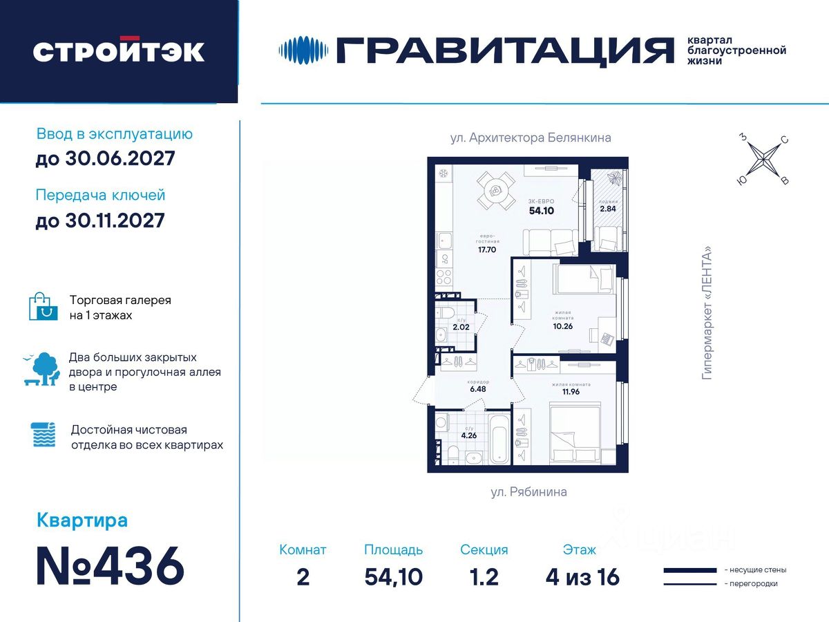 Удачные решения Новый квартал благоустроенной жизни ''Гравитация'' мы разместили в периметре улиц Рябинина и Академика Ландау. У квартала 5 этапов строительства, а всю работу мы завершим к 2030 году. Авторы проекта гармонично совместили в оформлении природные элементы и современный дизайн. Волнообразные очертания на стенах вдохновлены силой ветра и движением воды. Скруглённые углы подчеркивают элегантный силуэт, а контрастная палитра акцентов и контурная подсветка верхних этажей создают выразительный архитектурный образ. Первый этап строительства: — Секция 1.1 — 1 подъезд 26 этажей — Секция 1.2 — 2 подъезда 16 этажей — Секция 1.3 — 1 подъезд 12 этажей Здесь всё и сразу Гравитация — уютный и обособленный, и в то же время открытый и просторный квартал. Всё рядом: супермаркеты и парки, кино и рестораны, школы и сады. В нескольких шагах набережная реки Патрушихи. В квартале построят муниципальный детский сад на 200 мест, а на 5 этапе строительства мы возведём 6-уровневый надземный паркинг на 250 машин. На первых этажах домов для вас будет работать торговая галерея с магазинами, кафе и привычными бытовыми сервисами. В 1 этапе строительства 631 квартира. Своя вселенная Развитый Академический район удобен и молодым семьям, и школьникам, и состоявшимся профессионалам. Рядом большой Преображенский парк с озером и Юго-Западный лесопарк с Тропой здоровья. — 3 минуты до Гипер Ленты — 10 минут на машине до ТРЦ ''Академический'', 15 минут до ЕКАД, 25 до центра — 6 школ и 6 детских садов — Спортивные комплексы и клубы Wake up, Bright Fit и Юность Богатые возможности В квартале два просторных закрытых двора общей площадью 1,4 гектара. Один двор объединяет 1 и 2 этапы строительства, другой — 3, 4 и 5 этапы. Между дворами — камерная прогулочная аллея для неспешных вечеров или полуденного отдыха. Во дворе первого этапа — зелёные участки из хвойных деревьев, акцентных кустарников и травянистых многолетников, а также сеть дорожек, детская площадка с песочницей, аттракционами и геопластикой, настольный теннис и зона для зарядки. А для комфорта и безопасности — вечернее освещение, охрана и постоянное видеонаблюдение. Пространство с заботой В просторных светлых лобби Гравитации — интеллигентный дизайн, помещения для колясок, высокие витражи и комфортная мебель. Выходы сквозные, на улицу и во двор. Лифты грузоподъёмностью 1000 и 450 кг. Мы подготовили для вас 44 уникальных варианта продуманных планировок, в том числе с кухнями-гостиными, гардеробными и мастер-спальнями. Здесь нет бесполезных зон, зато есть где посидеть в семейном кругу и разместить всё для удобства и комфорта. Современные технологии Мы позаботились о достойной чистовой отделке, чтобы вы могли уделить время главному. — Виниловые обои на флизелиновой основе, окрашенные стены в санузлах и на лоджиях — Натяжные потолки везде, кроме лоджий, там — окрашенные — Прочный влагостойкий ламинат и керамическая плитка — Межкомнатные двери светлых тонов и сейф-дверь на входе — Эргономичное размещение розеток и выключателей