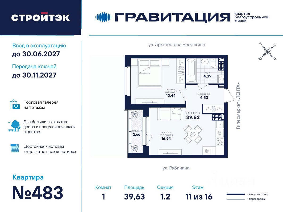Удачные решения Новый квартал благоустроенной жизни ''Гравитация'' мы разместили в периметре улиц Рябинина и Академика Ландау. У квартала 5 этапов строительства, а всю работу мы завершим к 2030 году. Авторы проекта гармонично совместили в оформлении природные элементы и современный дизайн. Волнообразные очертания на стенах вдохновлены силой ветра и движением воды. Скруглённые углы подчеркивают элегантный силуэт, а контрастная палитра акцентов и контурная подсветка верхних этажей создают выразительный архитектурный образ. Первый этап строительства: — Секция 1.1 — 1 подъезд 26 этажей — Секция 1.2 — 2 подъезда 16 этажей — Секция 1.3 — 1 подъезд 12 этажей Здесь всё и сразу Гравитация — уютный и обособленный, и в то же время открытый и просторный квартал. Всё рядом: супермаркеты и парки, кино и рестораны, школы и сады. В нескольких шагах набережная реки Патрушихи. В квартале построят муниципальный детский сад на 200 мест, а на 5 этапе строительства мы возведём 6-уровневый надземный паркинг на 250 машин. На первых этажах домов для вас будет работать торговая галерея с магазинами, кафе и привычными бытовыми сервисами. В 1 этапе строительства 631 квартира. Своя вселенная Развитый Академический район удобен и молодым семьям, и школьникам, и состоявшимся профессионалам. Рядом большой Преображенский парк с озером и Юго-Западный лесопарк с Тропой здоровья. — 3 минуты до Гипер Ленты — 10 минут на машине до ТРЦ ''Академический'', 15 минут до ЕКАД, 25 до центра — 6 школ и 6 детских садов — Спортивные комплексы и клубы Wake up, Bright Fit и Юность Богатые возможности В квартале два просторных закрытых двора общей площадью 1,4 гектара. Один двор объединяет 1 и 2 этапы строительства, другой — 3, 4 и 5 этапы. Между дворами — камерная прогулочная аллея для неспешных вечеров или полуденного отдыха. Во дворе первого этапа — зелёные участки из хвойных деревьев, акцентных кустарников и травянистых многолетников, а также сеть дорожек, детская площадка с песочницей, аттракционами и геопластикой, настольный теннис и зона для зарядки. А для комфорта и безопасности — вечернее освещение, охрана и постоянное видеонаблюдение. Пространство с заботой В просторных светлых лобби Гравитации — интеллигентный дизайн, помещения для колясок, высокие витражи и комфортная мебель. Выходы сквозные, на улицу и во двор. Лифты грузоподъёмностью 1000 и 450 кг. Мы подготовили для вас 44 уникальных варианта продуманных планировок, в том числе с кухнями-гостиными, гардеробными и мастер-спальнями. Здесь нет бесполезных зон, зато есть где посидеть в семейном кругу и разместить всё для удобства и комфорта. Современные технологии Мы позаботились о достойной чистовой отделке, чтобы вы могли уделить время главному. — Виниловые обои на флизелиновой основе, окрашенные стены в санузлах и на лоджиях — Натяжные потолки везде, кроме лоджий, там — окрашенные — Прочный влагостойкий ламинат и керамическая плитка — Межкомнатные двери светлых тонов и сейф-дверь на входе — Эргономичное размещение розеток и выключателей