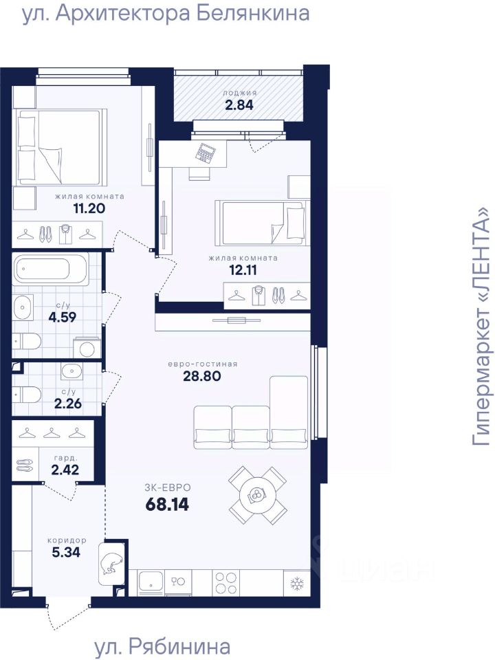 Общая площадь68,14 м2