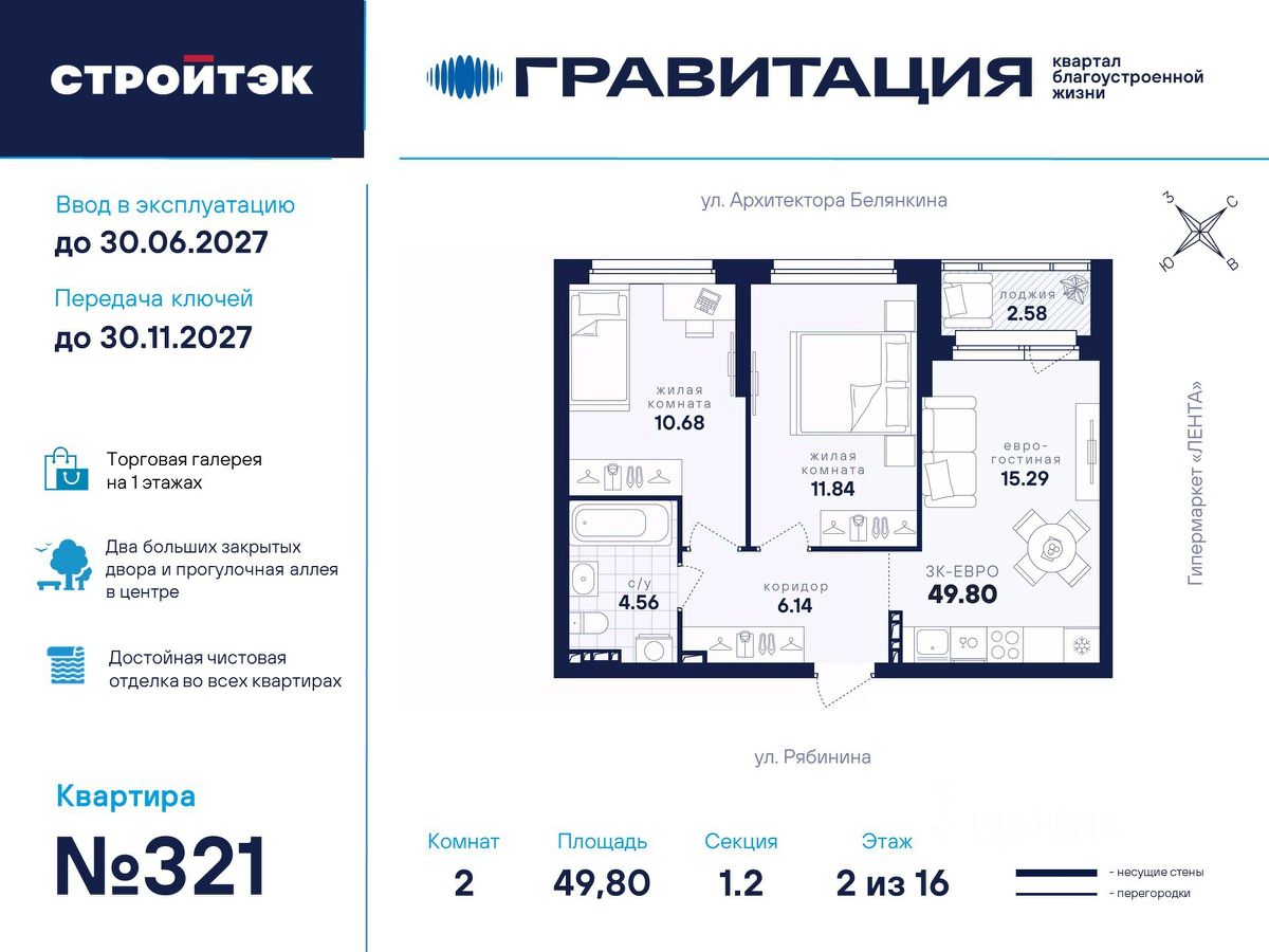 Удачные решения Новый квартал благоустроенной жизни ''Гравитация'' мы разместили в периметре улиц Рябинина и Академика Ландау. У квартала 5 этапов строительства, а всю работу мы завершим к 2030 году. Авторы проекта гармонично совместили в оформлении природные элементы и современный дизайн. Волнообразные очертания на стенах вдохновлены силой ветра и движением воды. Скруглённые углы подчеркивают элегантный силуэт, а контрастная палитра акцентов и контурная подсветка верхних этажей создают выразительный архитектурный образ. Первый этап строительства: — Секция 1.1 — 1 подъезд 26 этажей — Секция 1.2 — 2 подъезда 16 этажей — Секция 1.3 — 1 подъезд 12 этажей Здесь всё и сразу Гравитация — уютный и обособленный, и в то же время открытый и просторный квартал. Всё рядом: супермаркеты и парки, кино и рестораны, школы и сады. В нескольких шагах набережная реки Патрушихи. В квартале построят муниципальный детский сад на 200 мест, а на 5 этапе строительства мы возведём 6-уровневый надземный паркинг на 250 машин. На первых этажах домов для вас будет работать торговая галерея с магазинами, кафе и привычными бытовыми сервисами. В 1 этапе строительства 631 квартира. Своя вселенная Развитый Академический район удобен и молодым семьям, и школьникам, и состоявшимся профессионалам. Рядом большой Преображенский парк с озером и Юго-Западный лесопарк с Тропой здоровья. — 3 минуты до Гипер Ленты — 10 минут на машине до ТРЦ ''Академический'', 15 минут до ЕКАД, 25 до центра — 6 школ и 6 детских садов — Спортивные комплексы и клубы Wake up, Bright Fit и Юность Богатые возможности В квартале два просторных закрытых двора общей площадью 1,4 гектара. Один двор объединяет 1 и 2 этапы строительства, другой — 3, 4 и 5 этапы. Между дворами — камерная прогулочная аллея для неспешных вечеров или полуденного отдыха. Во дворе первого этапа — зелёные участки из хвойных деревьев, акцентных кустарников и травянистых многолетников, а также сеть дорожек, детская площадка с песочницей, аттракционами и геопластикой, настольный теннис и зона для зарядки. А для комфорта и безопасности — вечернее освещение, охрана и постоянное видеонаблюдение. Пространство с заботой В просторных светлых лобби Гравитации — интеллигентный дизайн, помещения для колясок, высокие витражи и комфортная мебель. Выходы сквозные, на улицу и во двор. Лифты грузоподъёмностью 1000 и 450 кг. Мы подготовили для вас 44 уникальных варианта продуманных планировок, в том числе с кухнями-гостиными, гардеробными и мастер-спальнями. Здесь нет бесполезных зон, зато есть где посидеть в семейном кругу и разместить всё для удобства и комфорта. Современные технологии Мы позаботились о достойной чистовой отделке, чтобы вы могли уделить время главному. — Виниловые обои на флизелиновой основе, окрашенные стены в санузлах и на лоджиях — Натяжные потолки везде, кроме лоджий, там — окрашенные — Прочный влагостойкий ламинат и керамическая плитка — Межкомнатные двери светлых тонов и сейф-дверь на входе — Эргономичное размещение розеток и выключателей