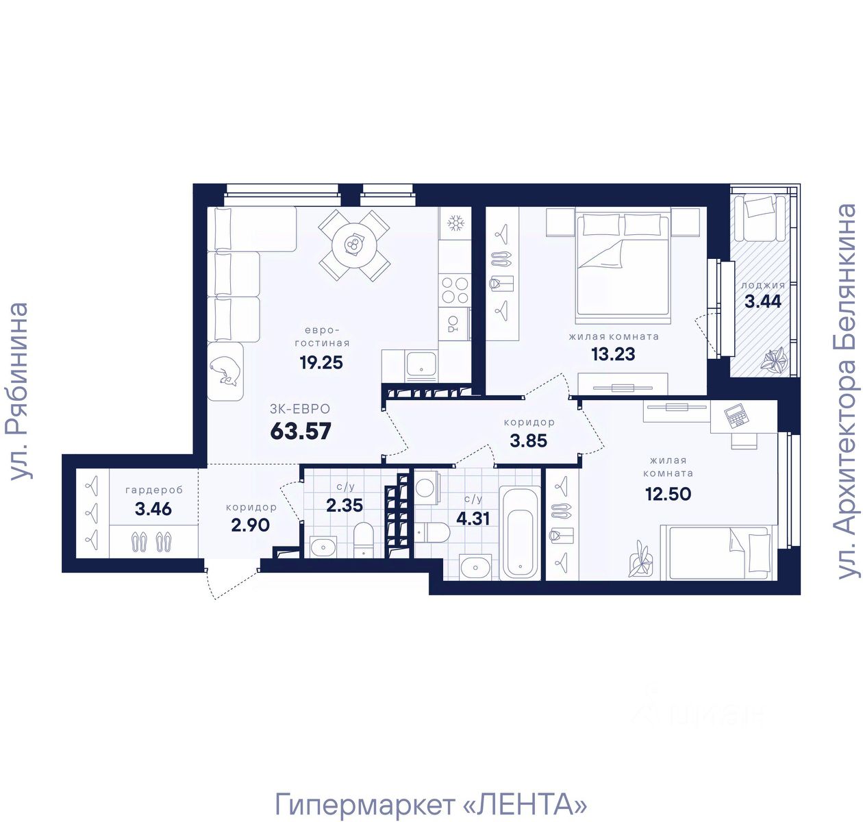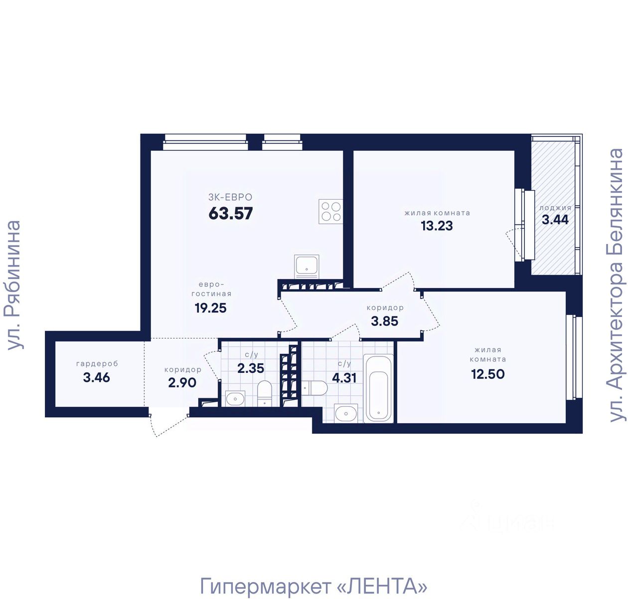 Общая площадь63,57 м2