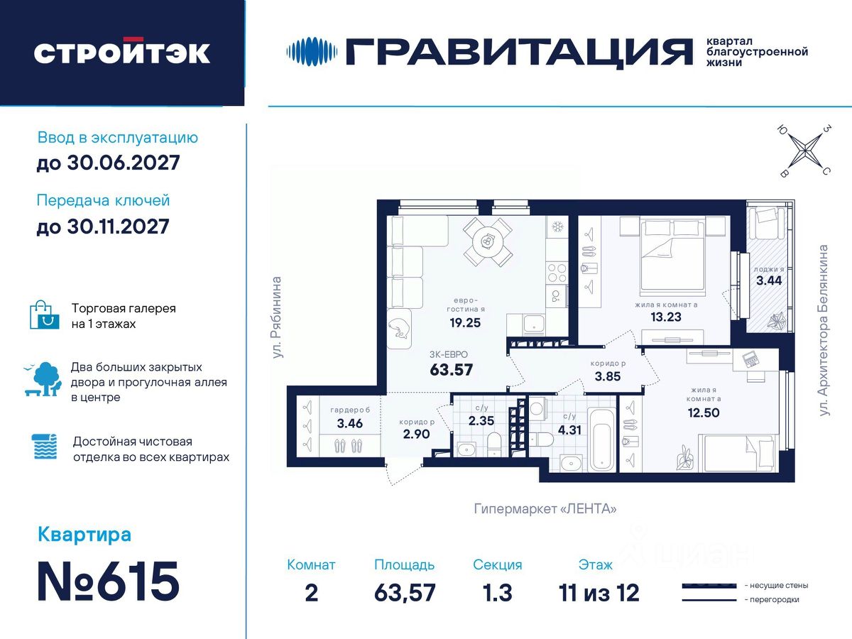 Удачные решения Новый квартал благоустроенной жизни ''Гравитация'' мы разместили в периметре улиц Рябинина и Академика Ландау. У квартала 5 этапов строительства, а всю работу мы завершим к 2030 году. Авторы проекта гармонично совместили в оформлении природные элементы и современный дизайн. Волнообразные очертания на стенах вдохновлены силой ветра и движением воды. Скруглённые углы подчеркивают элегантный силуэт, а контрастная палитра акцентов и контурная подсветка верхних этажей создают выразительный архитектурный образ. Первый этап строительства: — Секция 1.1 — 1 подъезд 26 этажей — Секция 1.2 — 2 подъезда 16 этажей — Секция 1.3 — 1 подъезд 12 этажей Здесь всё и сразу Гравитация — уютный и обособленный, и в то же время открытый и просторный квартал. Всё рядом: супермаркеты и парки, кино и рестораны, школы и сады. В нескольких шагах набережная реки Патрушихи. В квартале построят муниципальный детский сад на 200 мест, а на 5 этапе строительства мы возведём 6-уровневый надземный паркинг на 250 машин. На первых этажах домов для вас будет работать торговая галерея с магазинами, кафе и привычными бытовыми сервисами. В 1 этапе строительства 631 квартира. Своя вселенная Развитый Академический район удобен и молодым семьям, и школьникам, и состоявшимся профессионалам. Рядом большой Преображенский парк с озером и Юго-Западный лесопарк с Тропой здоровья. — 3 минуты до Гипер Ленты — 10 минут на машине до ТРЦ ''Академический'', 15 минут до ЕКАД, 25 до центра — 6 школ и 6 детских садов — Спортивные комплексы и клубы Wake up, Bright Fit и Юность Богатые возможности В квартале два просторных закрытых двора общей площадью 1,4 гектара. Один двор объединяет 1 и 2 этапы строительства, другой — 3, 4 и 5 этапы. Между дворами — камерная прогулочная аллея для неспешных вечеров или полуденного отдыха. Во дворе первого этапа — зелёные участки из хвойных деревьев, акцентных кустарников и травянистых многолетников, а также сеть дорожек, детская площадка с песочницей, аттракционами и геопластикой, настольный теннис и зона для зарядки. А для комфорта и безопасности — вечернее освещение, охрана и постоянное видеонаблюдение. Пространство с заботой В просторных светлых лобби Гравитации — интеллигентный дизайн, помещения для колясок, высокие витражи и комфортная мебель. Выходы сквозные, на улицу и во двор. Лифты грузоподъёмностью 1000 и 450 кг. Мы подготовили для вас 44 уникальных варианта продуманных планировок, в том числе с кухнями-гостиными, гардеробными и мастер-спальнями. Здесь нет бесполезных зон, зато есть где посидеть в семейном кругу и разместить всё для удобства и комфорта. Современные технологии Мы позаботились о достойной чистовой отделке, чтобы вы могли уделить время главному. — Виниловые обои на флизелиновой основе, окрашенные стены в санузлах и на лоджиях — Натяжные потолки везде, кроме лоджий, там — окрашенные — Прочный влагостойкий ламинат и керамическая плитка — Межкомнатные двери светлых тонов и сейф-дверь на входе — Эргономичное размещение розеток и выключателей