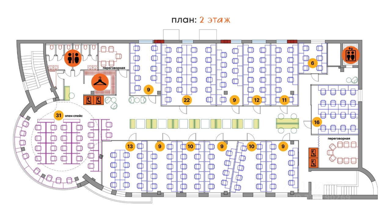 Офисы от 6 до 22 рабочих мест в пространстве 2 240 м². Также можно занять весь этаж полностью.