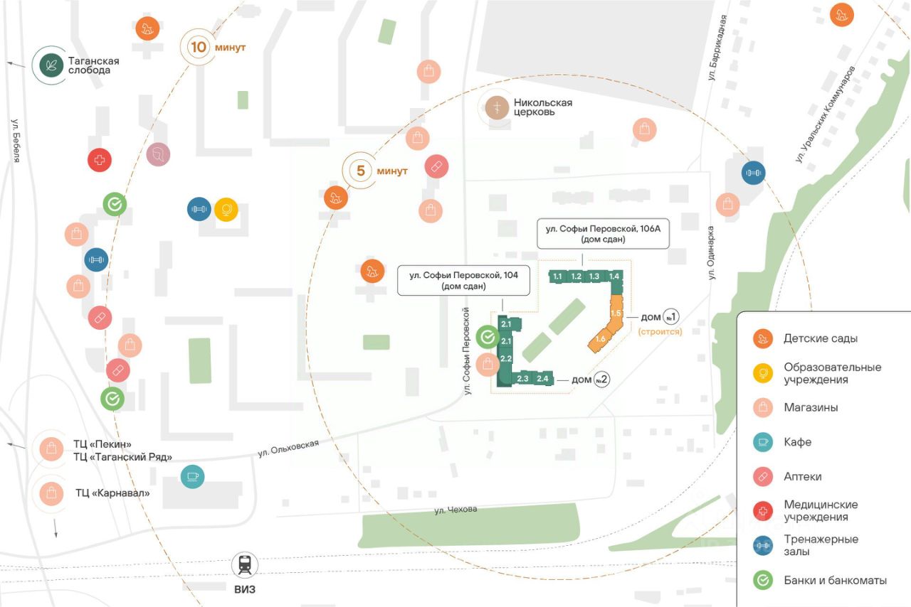 20 минут пешком до парка ''Таганская слобода'' 15 минут на машине до кольцевой дороги, а до центра — полчаса даже по пробкам 10 минут на машине до ТЦ ''Карнавал'' 7 школ и 11 детсадов поблизости 6 продуктовых магазинов рядом