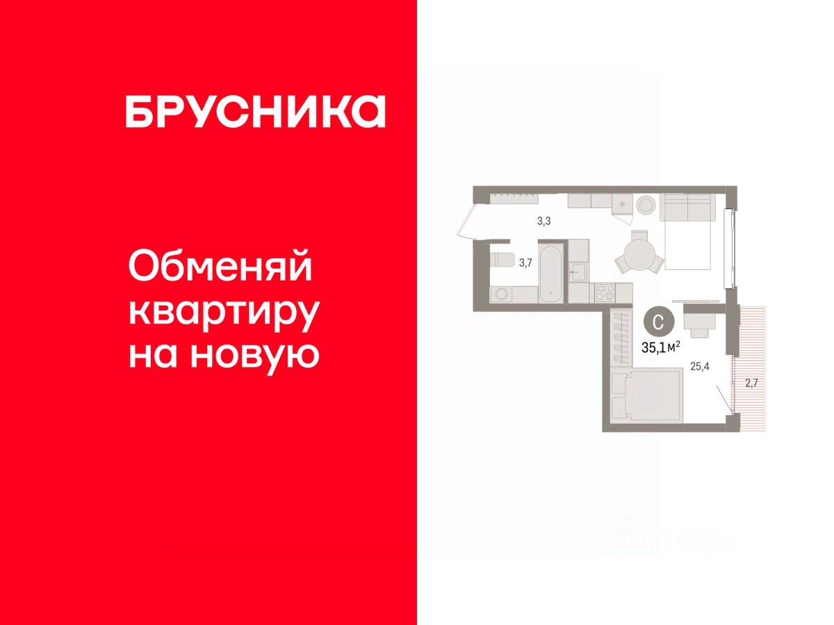Однокомнатная студия от застройщика с предчистовой отделкой в ЖК ''Квартал Траектория'' на 11 этаже. Общая площадь: 35.1 кв.м., площадь гостиной 25.4 кв.м., из которых 5 кв.м. выделено под кухонную зону. Все окна выходят на одну сторону. В квартире один балкон, один совмещенный санузел. Высота потолков 2.82 м.