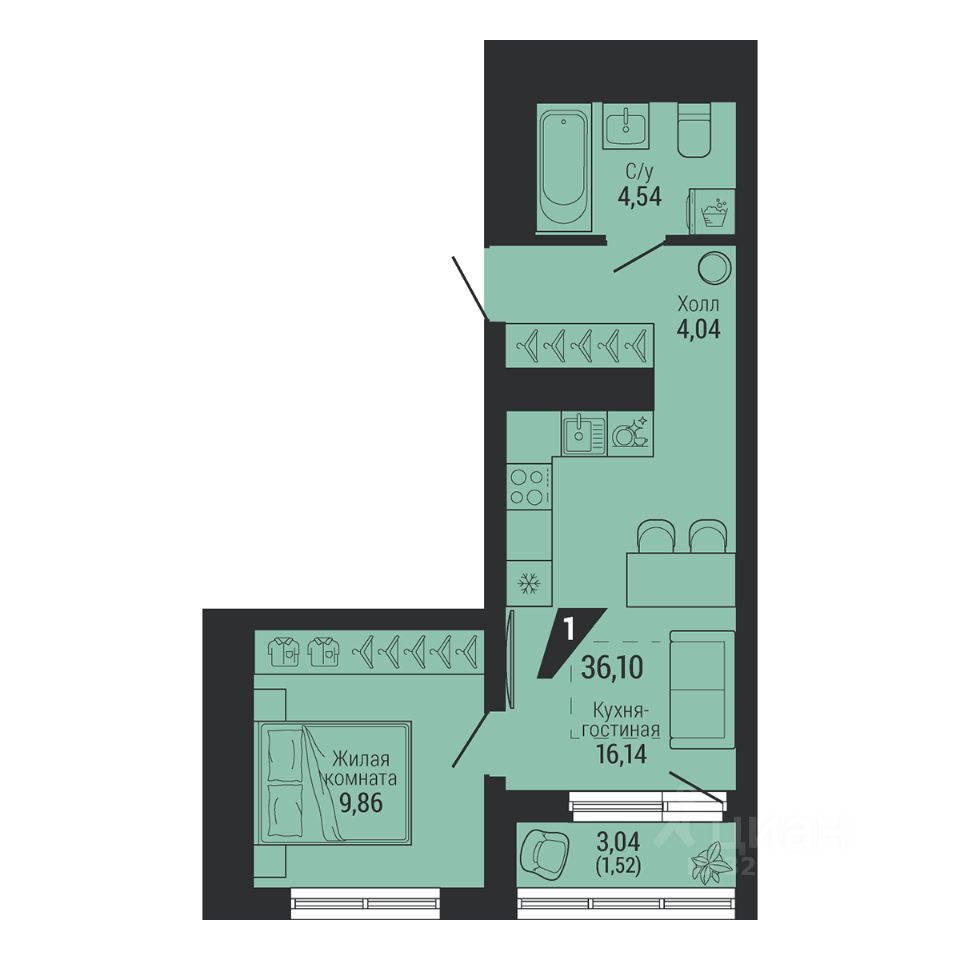 Общая площадь36,1 м2
