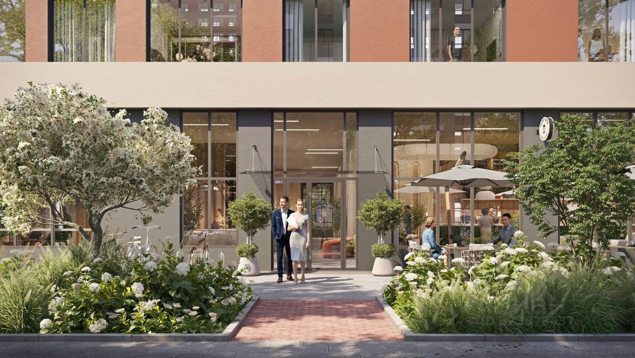 Двор с ландшафтным озеленением разделен на три зоны. Для детей — игровые площадки для разных возрастных групп, для взрослых — лаунж-зона с креслами и столиками для отдыха, для спортсменов — воркаут-площадка.