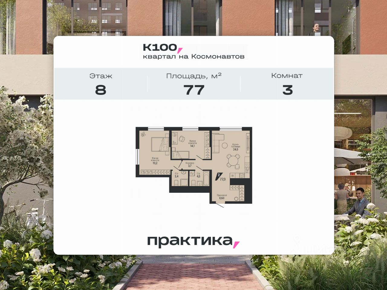 Жилой квартал ''К100'' на Космонавтов, 100 состоит из трех монолитно-кирпичных домов, объединенных общим двором. Застройщик компания ''Практика''.