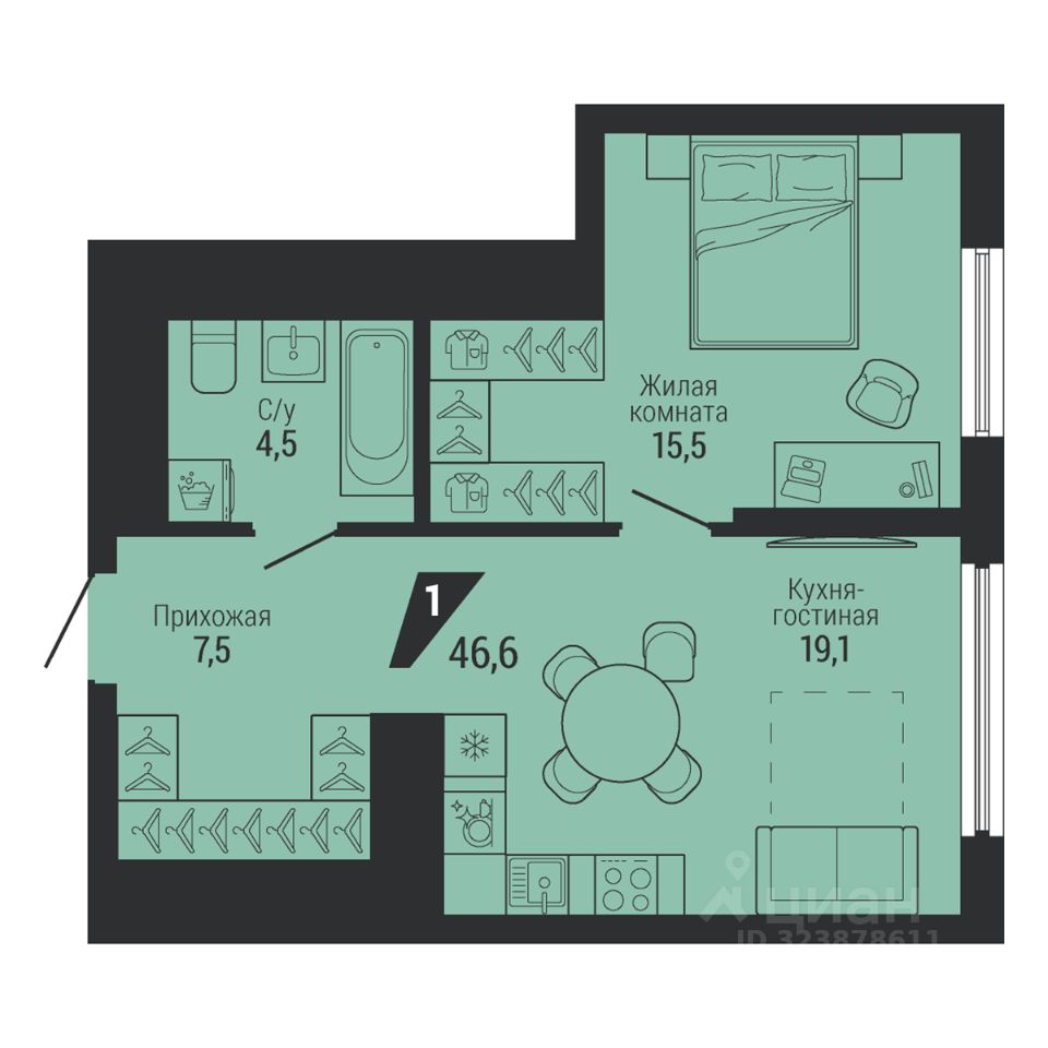 Общая площадь46,6 м2