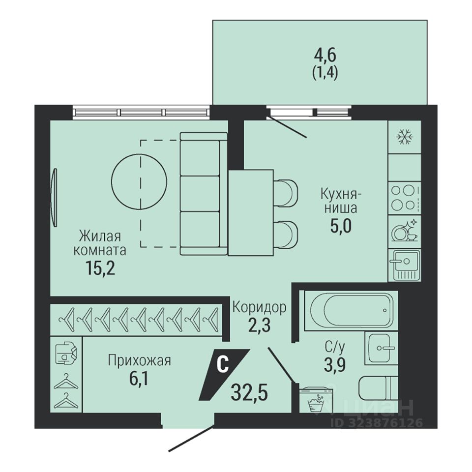 Общая площадь33,9 м2