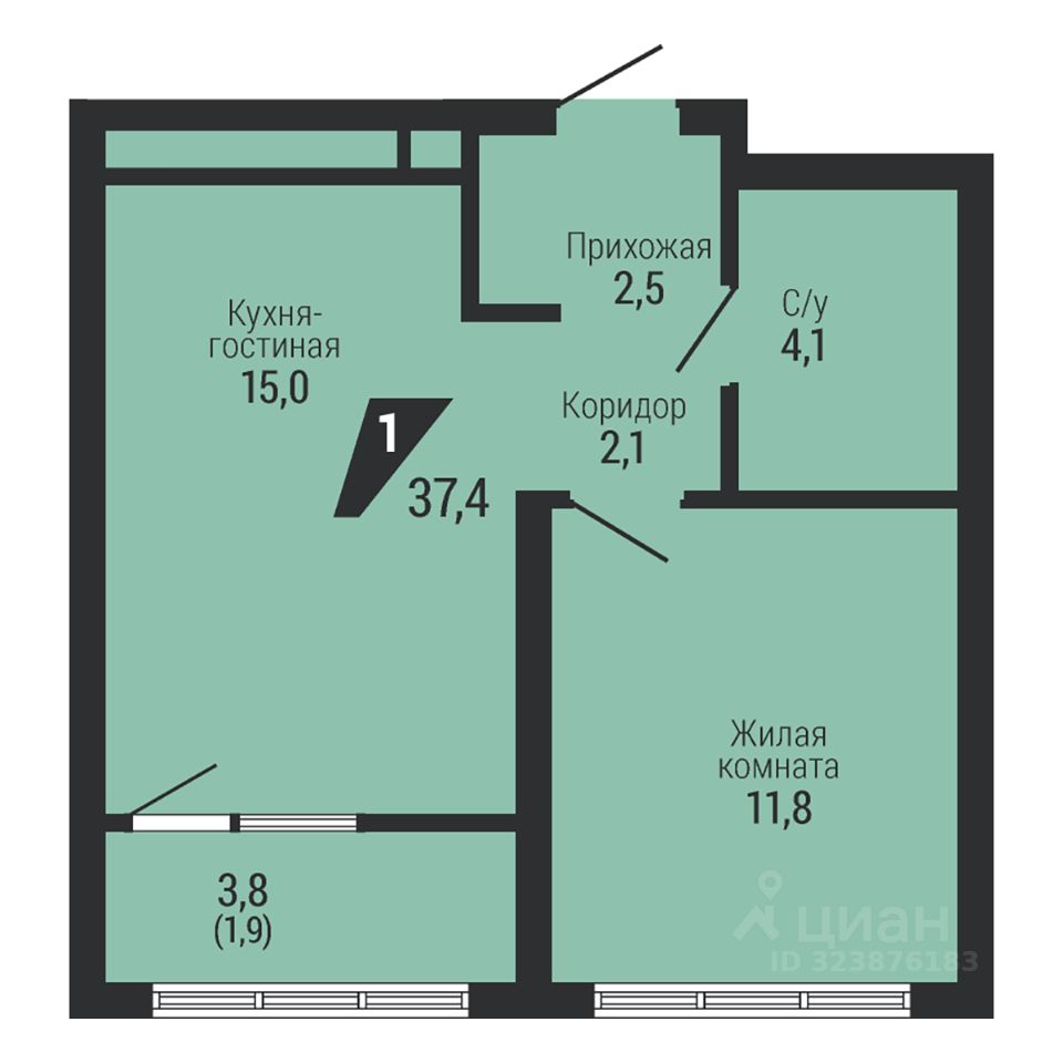 Общая площадь37,4 м2