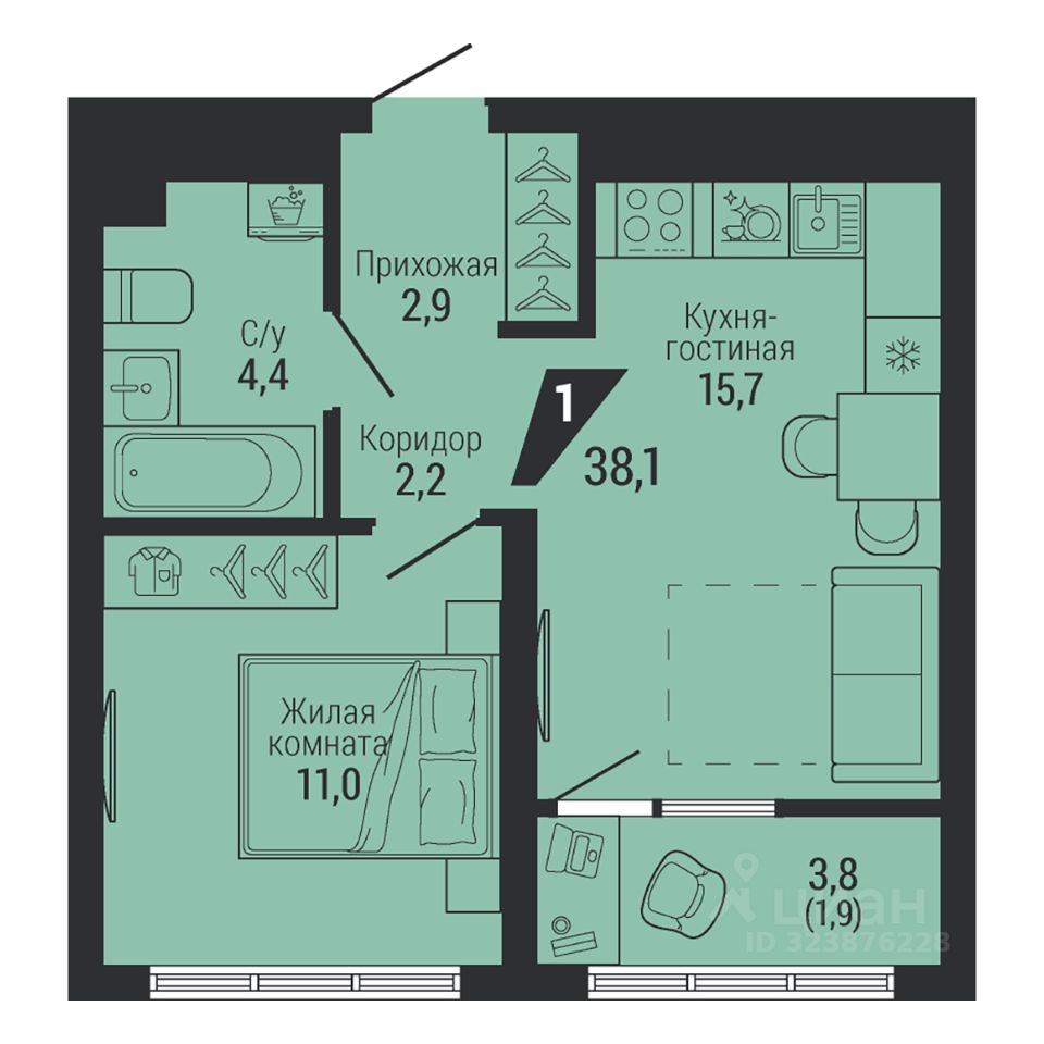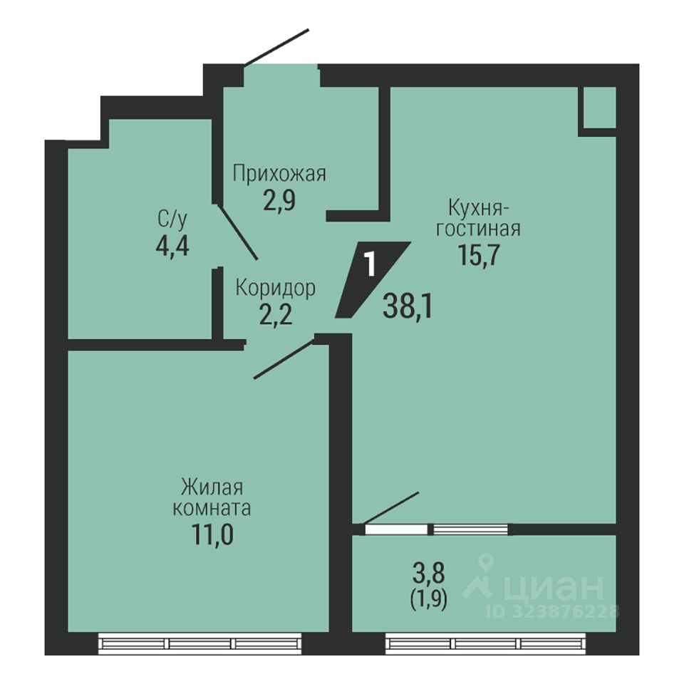 Общая площадь38,1 м2