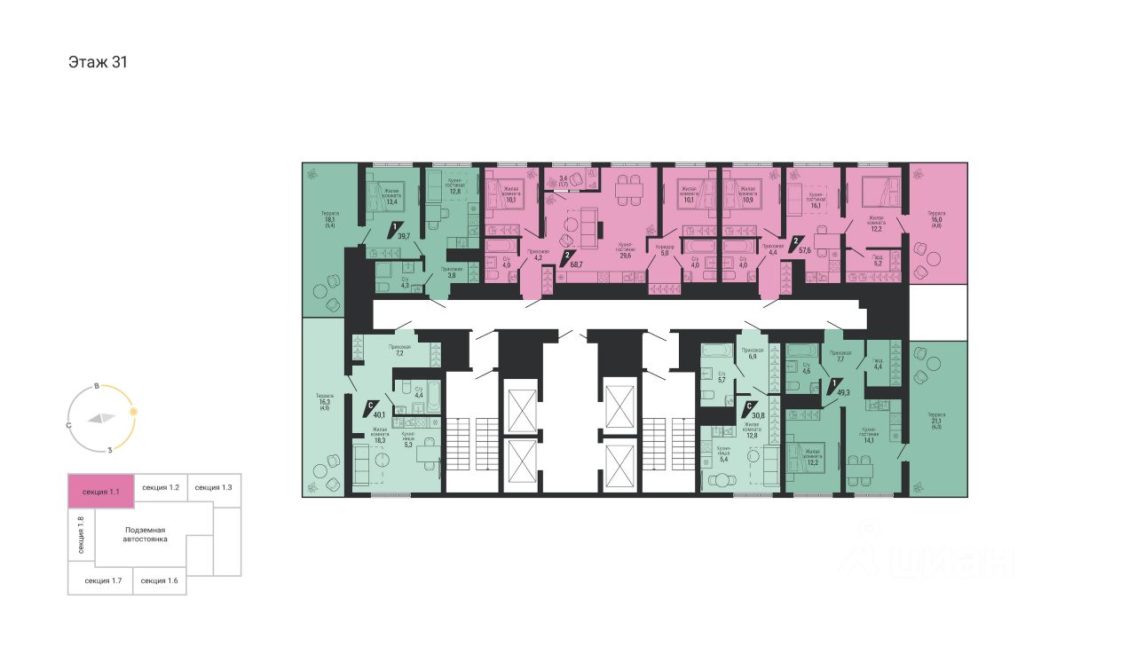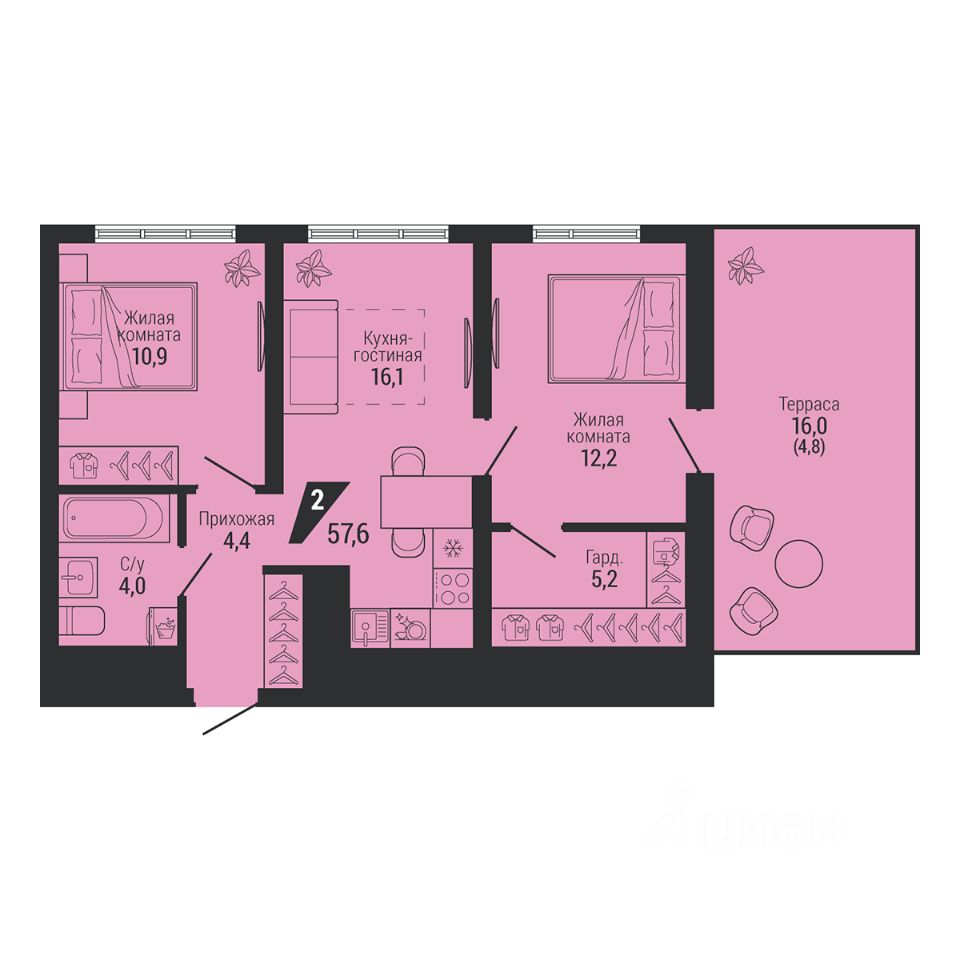 Общая площадь57,6 м2