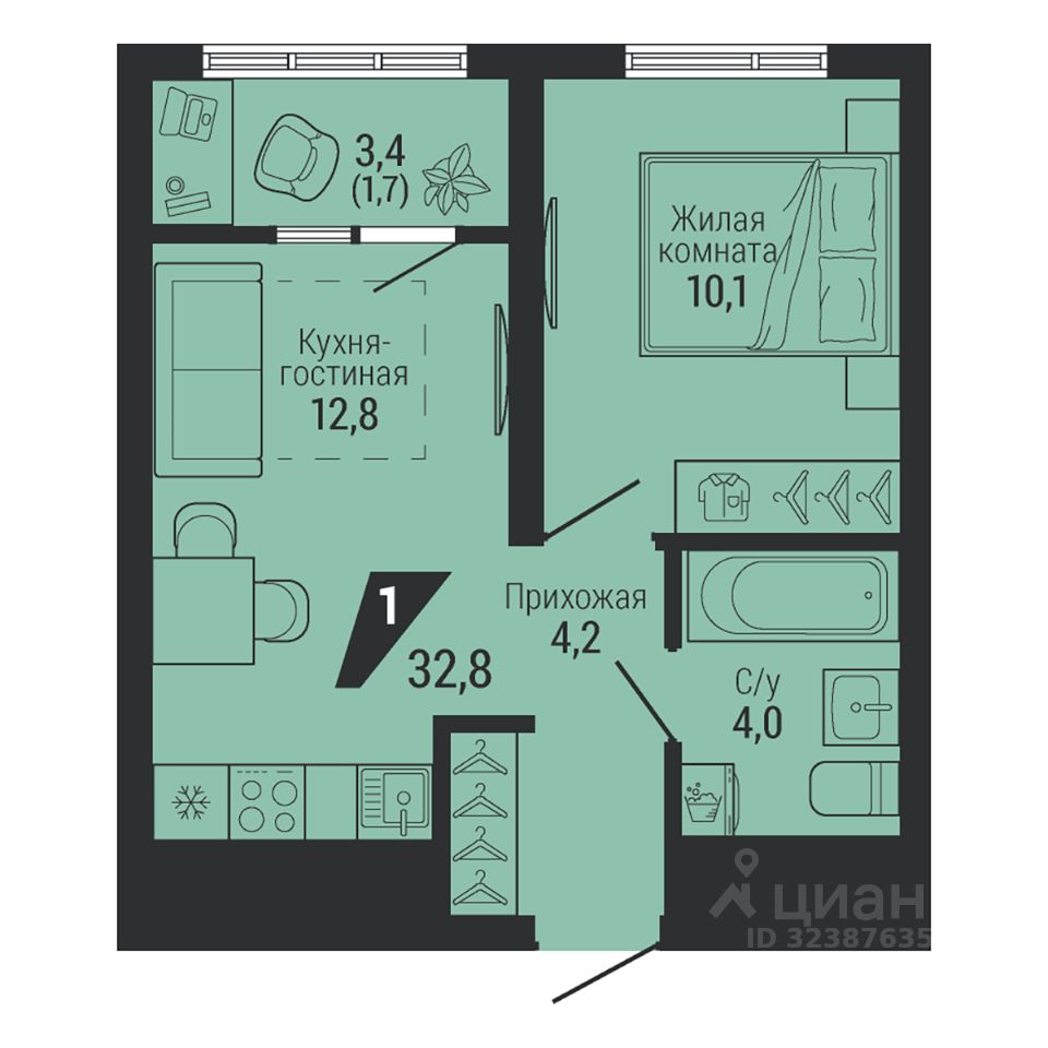 Общая площадь32,8 м2