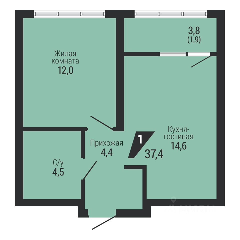 Общая площадь37,4 м2