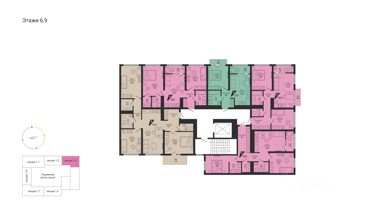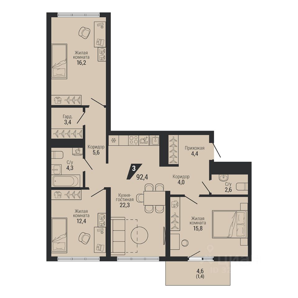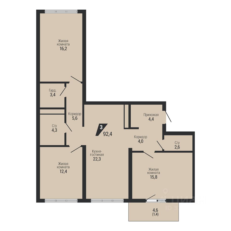 Общая площадь92,4 м2