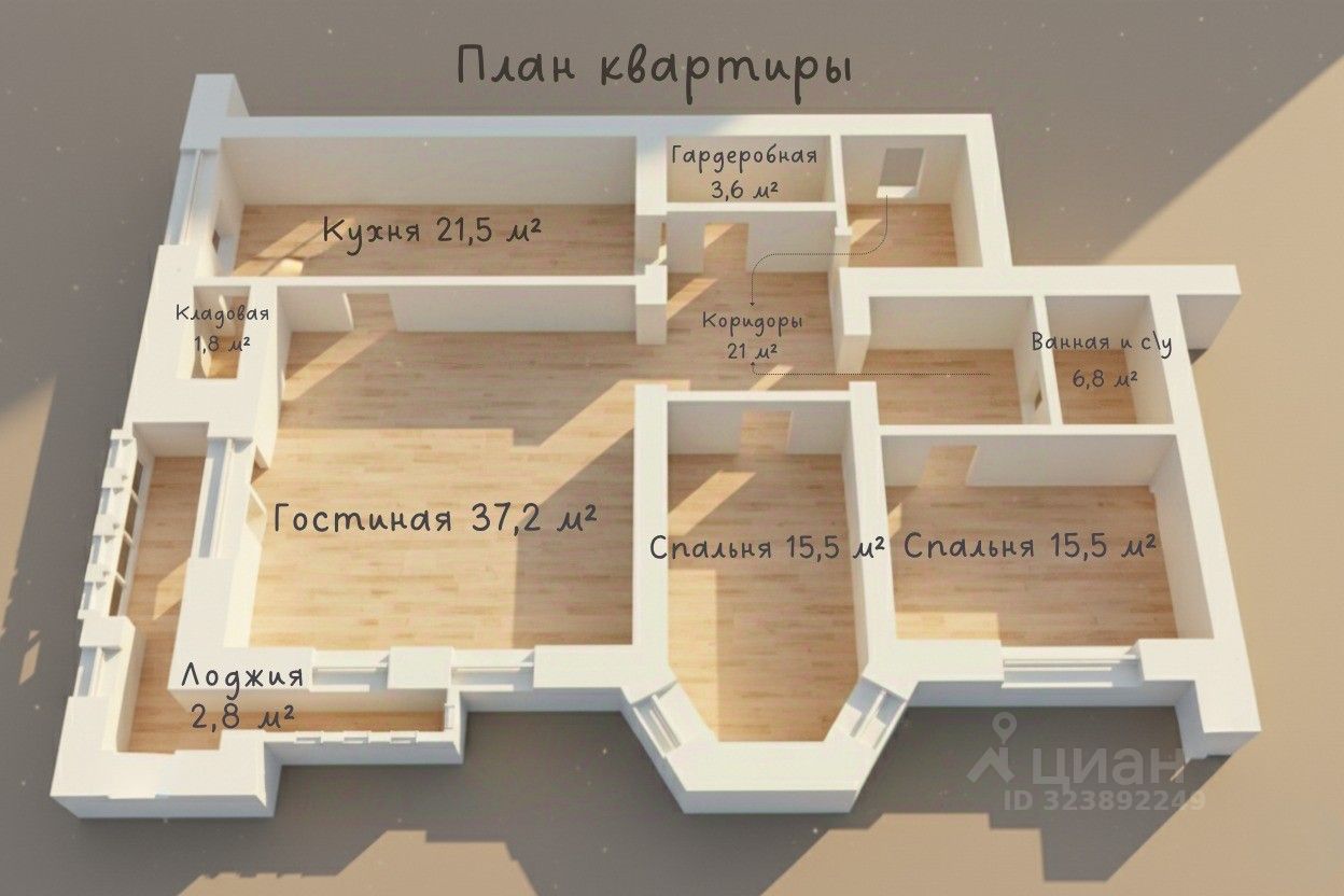 Комнаты: • Просторная гостиная площадью 37.2 кв.м с выходом на балкон • Две уютные спальни по 15.5 кв.м каждая Кухня и дополнительные помещения: • Просторная кухня 21 кв.м с кладовой 3.6 кв.м • Ванная комната совмещена с санузлом, тёплый пол, площадь 6.8 кв.м • Широкий холл 21 кв.м с гардеробной 1.8 кв.м • Пол: ламинат • Лоджия 2.8 кв.м • Дополнительная кладовая в цокольном помещении дома