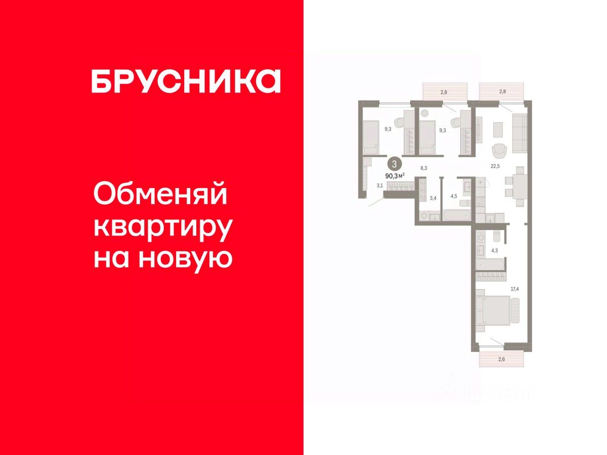 Квартира с кухней-гостиной и тремя спальнями в Южных кварталах. Особенности планировки: балкон, вид во двор, мастер-спальня, окна на две стороны, постирочная, предчистовая отделка, разнесённые спальни. квартиры в нашей базе: ЮКВ11-Ж4.3.1.