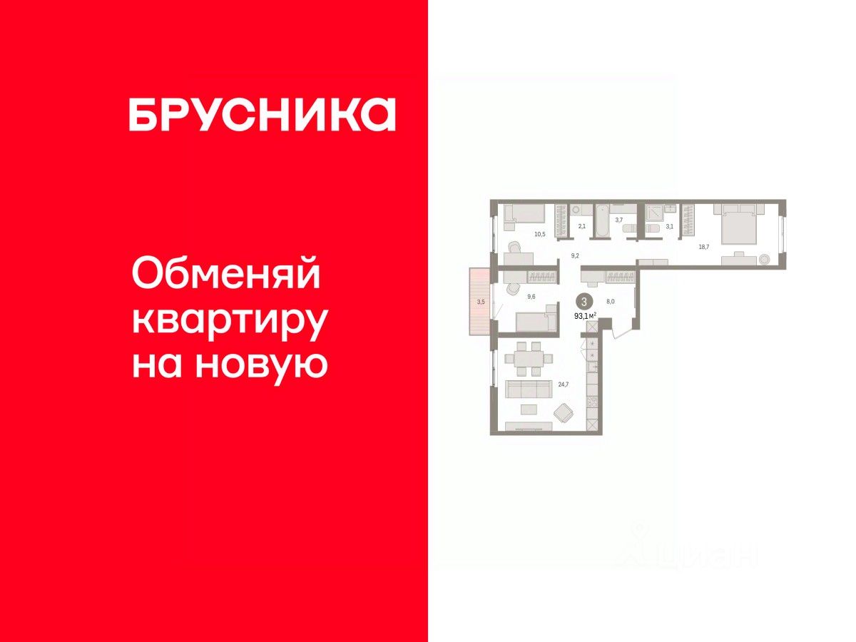 Квартира с кухней-гостиной и тремя спальнями в Южных кварталах. Особенности планировки: балкон, вид во двор, мастер-спальня, окна на две стороны, постирочная, предчистовая отделка, разнесённые спальни. квартиры в нашей базе: ЮКВ08-Ж5.4.1.