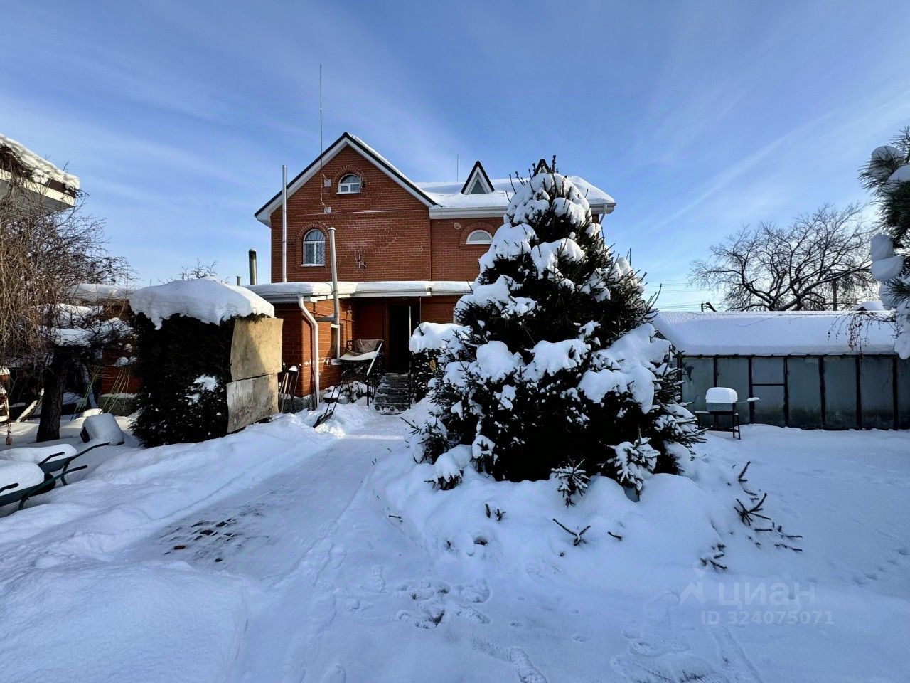 Коттедж построен из пеноблоков и облицован красным кирпичом.