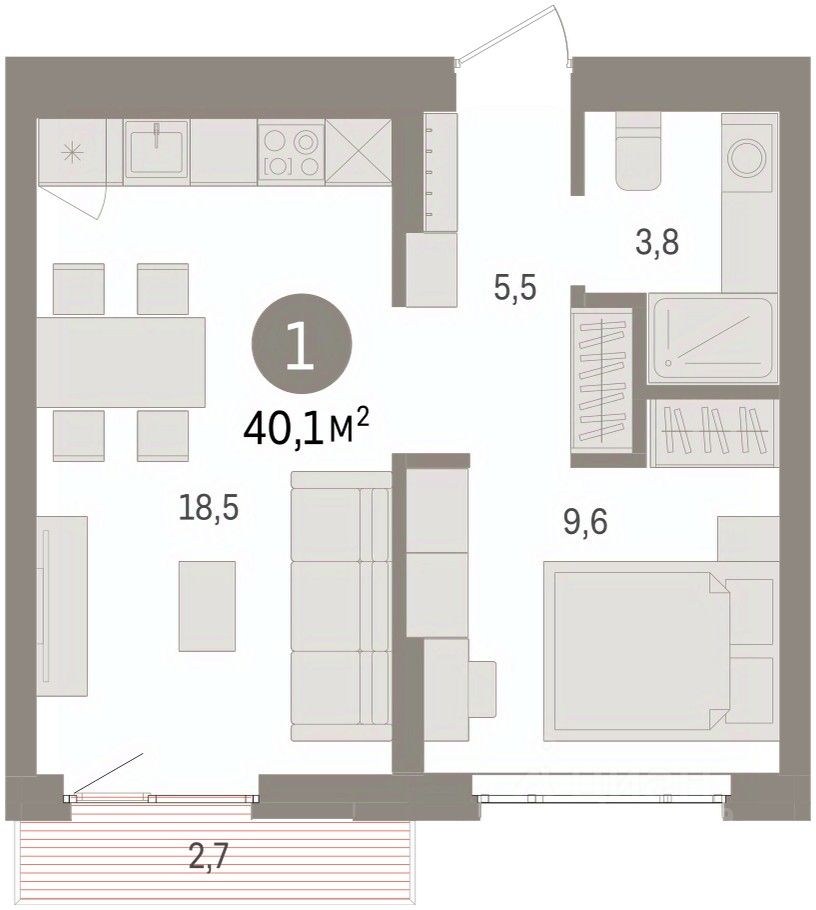 Квартира с кухней-гостиной и одной спальней в квартале ''Траектория''. Особенности планировки: балкон, предчистовая отделка. квартиры в нашей базе: МНВ01-Ж14.5.4.