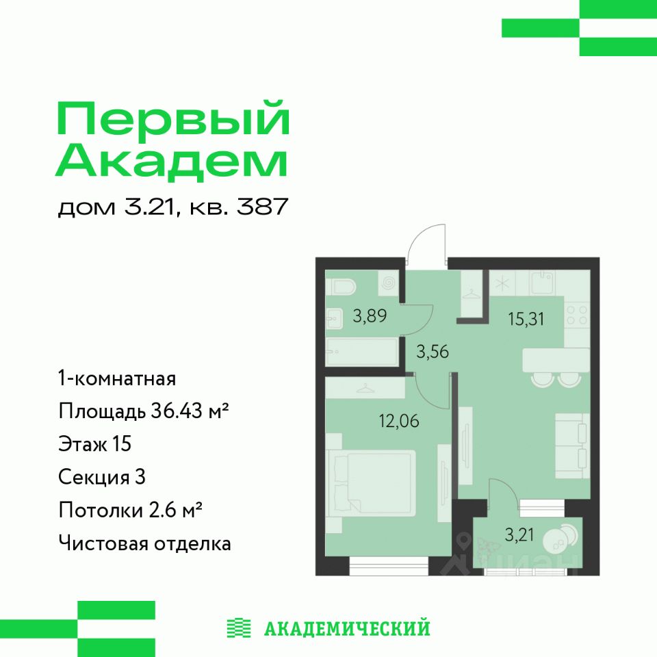Продается 1-комнатная квартира площадью 36.43 кв.м. от девелопера ''Академический'' в жилом квартале ''Первый Академ''. Срок сдачи дома в 2028 году. Выгоды и скидка напрямую от застройщика.