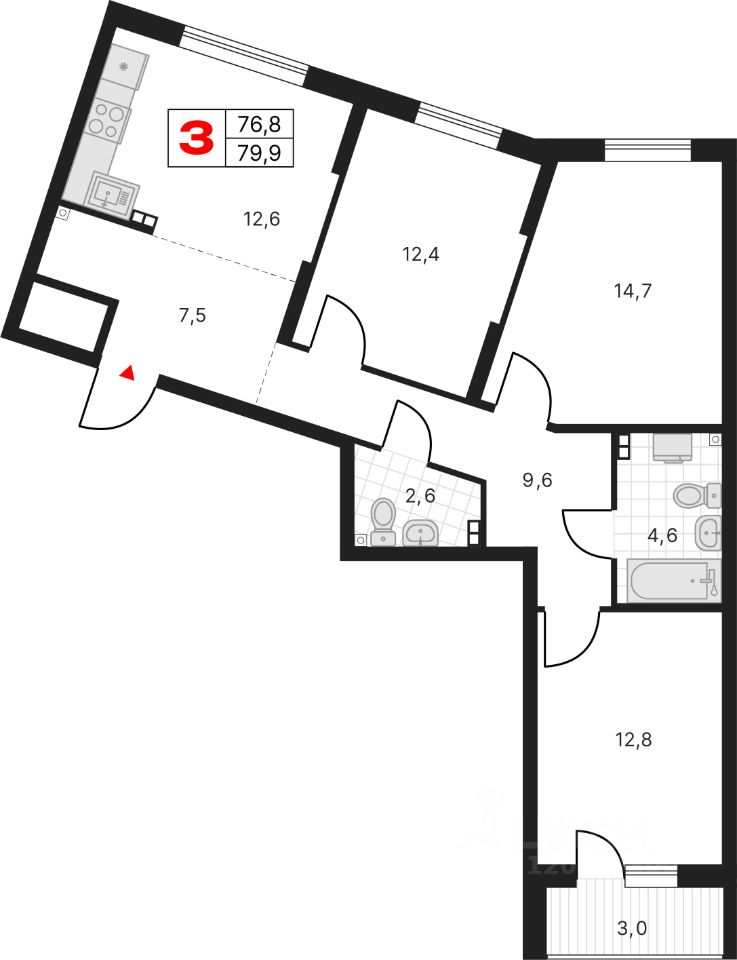Продаётся квартира в Клубный дом ''Московский Квартал'', 12 дом. 3-комнатная квартира, 79,89 м², 150. Стоимость указана с учетом чистовой отделки.
