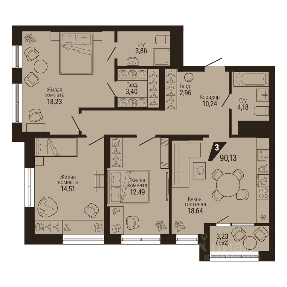 Общая площадь90,13 м2