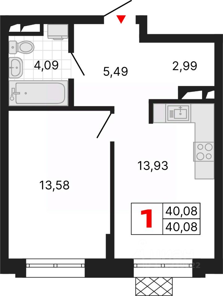 1-комн. квартира с предчистовой отделкой в ЖК ''Алиса'' на 2 этаже. Общая площадь: 40.08 кв.м., жилая: 13.58 кв.м., площадь просторной кухни-столовой: 13.93 кв.м. Все окна выходят на одну сторону. В квартире один совмещенный и один раздельный санузел. Высота потолков 2.72 м.