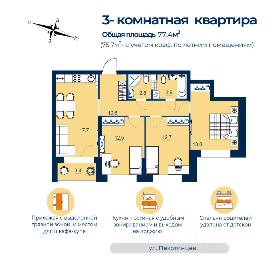 Продаётся 3-комнатная квартира в строящемся доме (Дом 1), срок сдачи: IV-кв. 2025, общей площадью 75.7 кв.м., на 6 этаже. Новый жилой комплекс ''Estelle'' от застройщика ''СЗ Инвестстрой'' расположен по адресу: г. Екатеринбург, улица Пехотинцев.