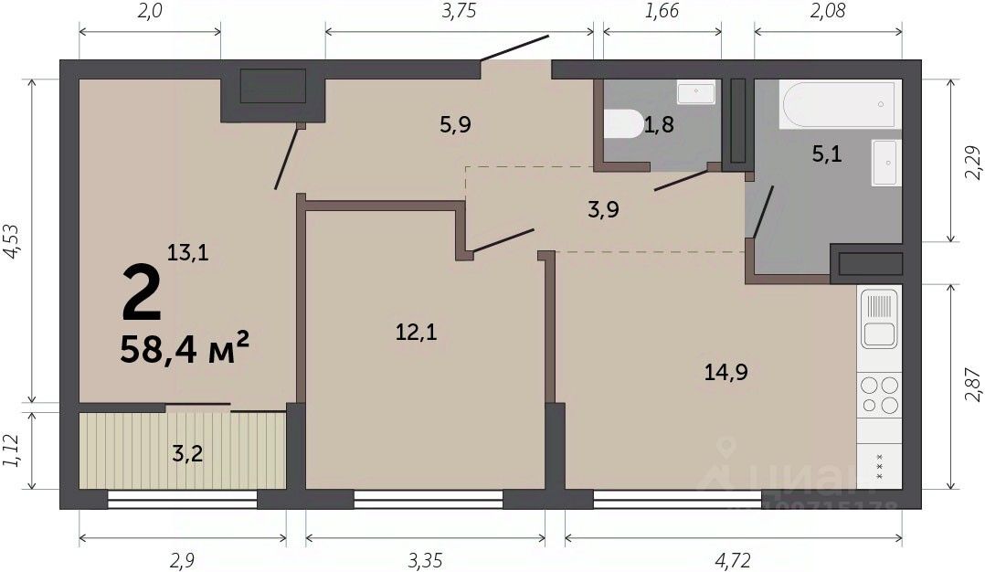 Общая площадь58,4 м2
