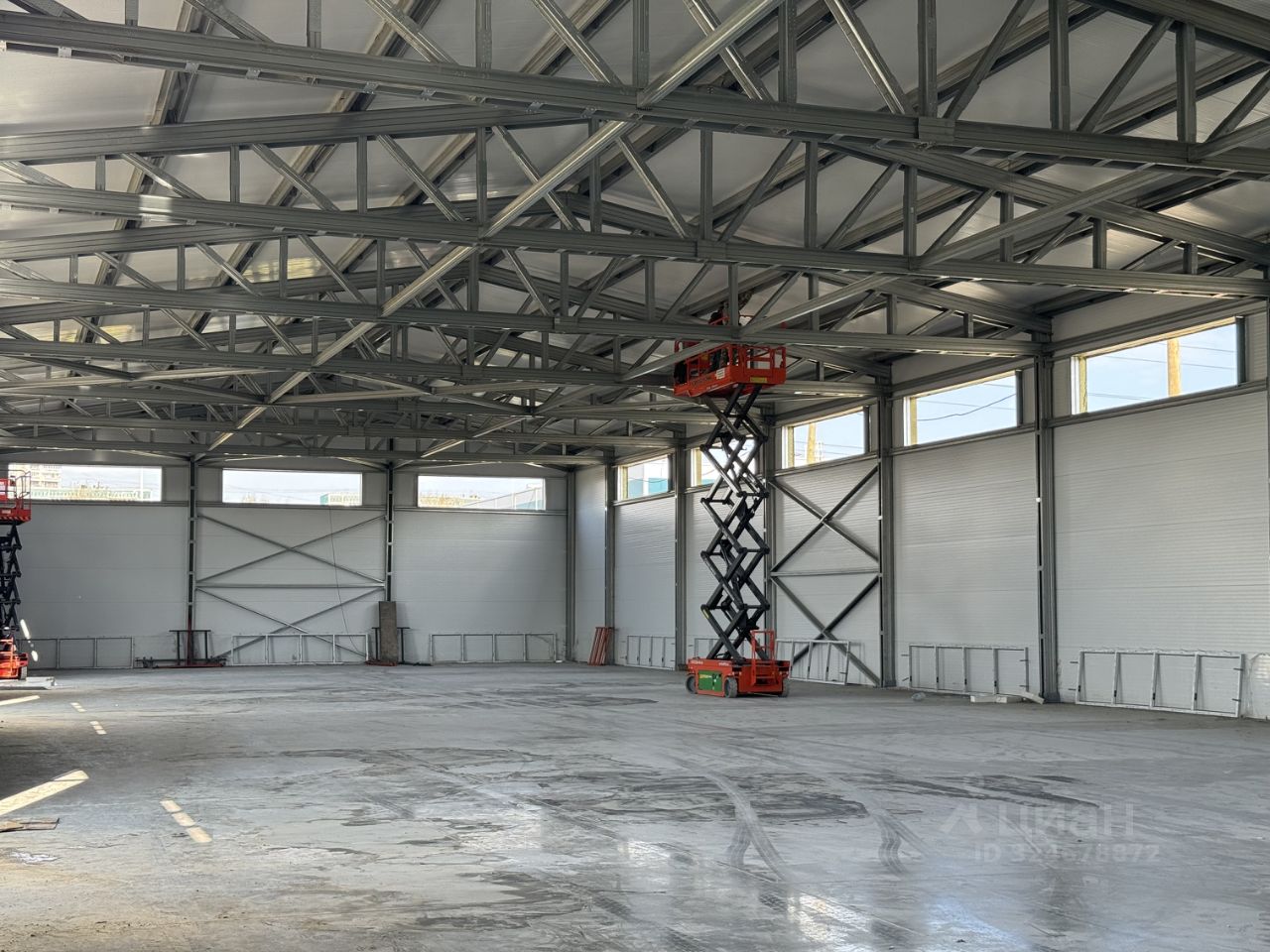 • Каркас металлоконструкции ЛСТК. • Кровля и ограждение (сэндвич-панели 150 мм). • Окна. Одинарный глухой стеклопакет, высота 4-6 м. • Подъемные ворота (с каждой стороны помещения). • Бетонный пол (топпинг, 200 мм). • Оборудованный заезд, разворотная площадка для грузового транспорта.
