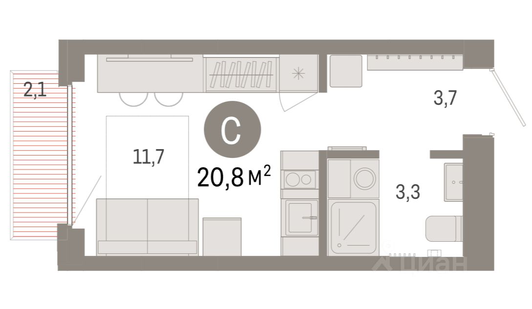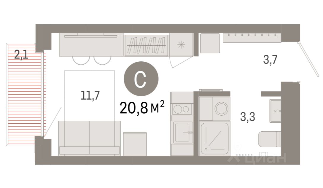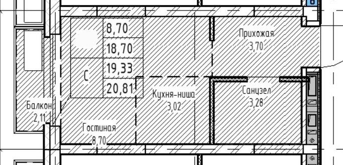 Общая проектная площадь квартиры составляет 20,81 кв.м. и состоит из суммы площади всех частей квартиры: прихожая 3,70 кв.м, санузел 3,28 кв.м, гостиная 8,70 кв.м, кухня-ниша 3,02 кв.м, балкон 2,11 кв.м.