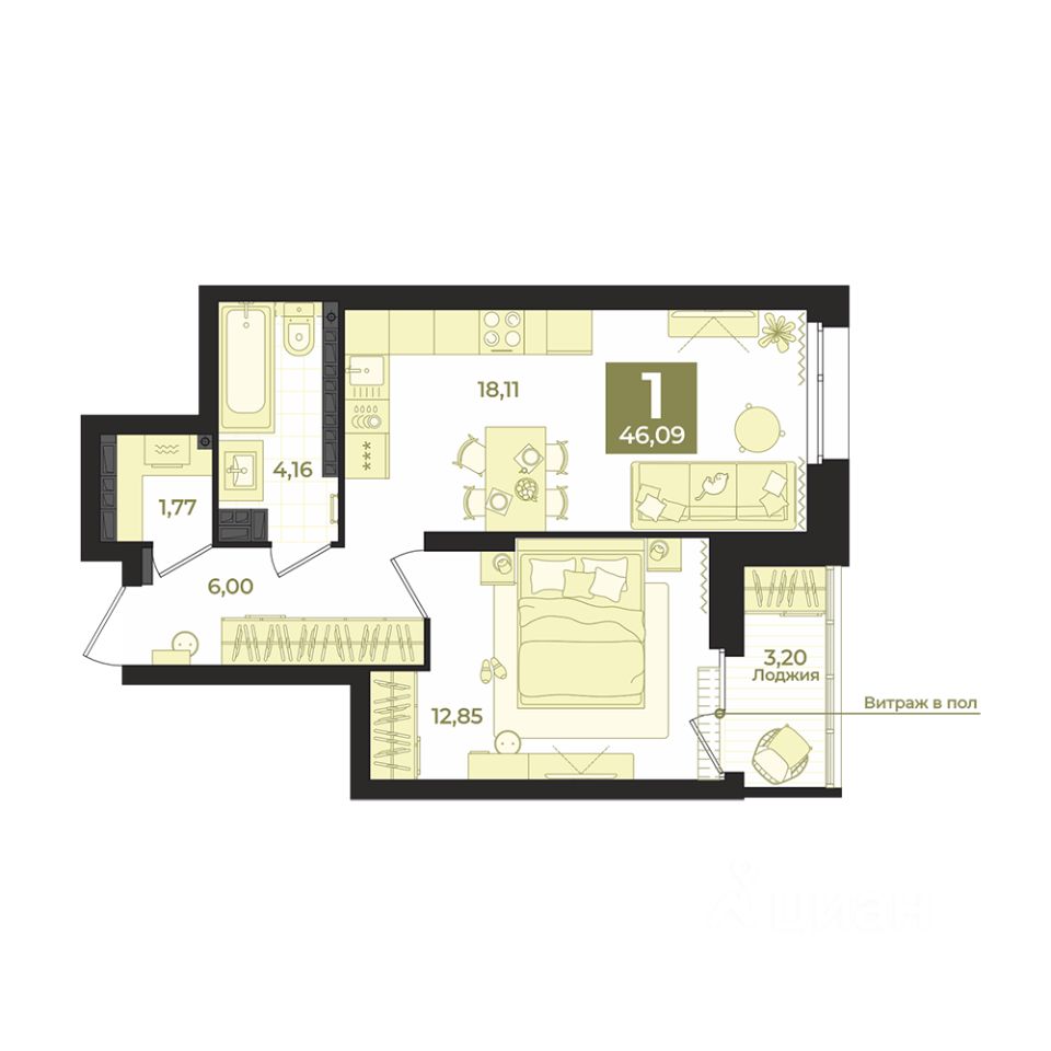 Общая площадь46,09 м2