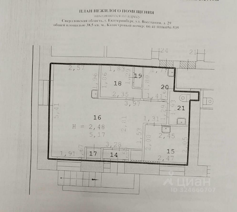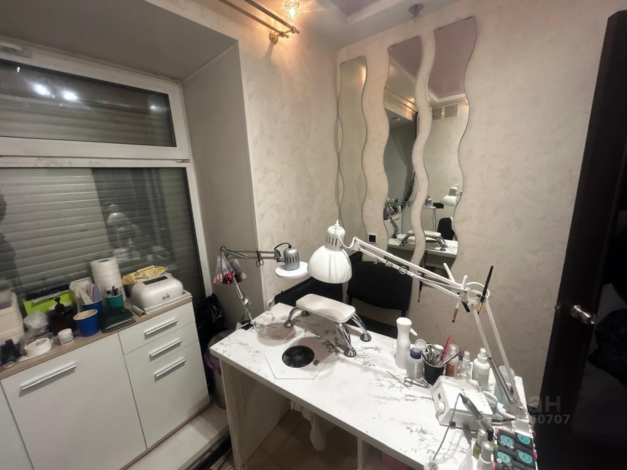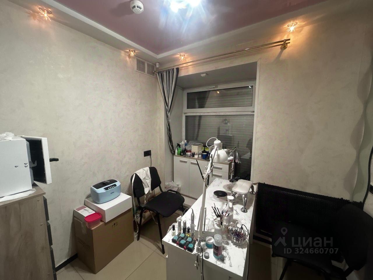 Площадь: 38,5 кв.м. (позволяет зонировать пространство на ресепшн, 5-6 рабочих места, зону ожидания).