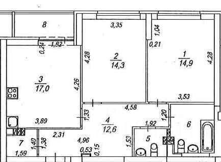 В первую очередь, обратите внимание на планировку, формат евротрешки: кухня-гостиная 17 кв.м. с выходом на лоджию и видом на лесопарк и верх-исетский пруд. Две комнаты, примерно одинаковой площади 14,3 и 14,9 кв.м. Два раздельных санузла и вместительный шкаф в коридоре под хранение одежды 2 кв.м. По итогу, очень удобная, рациональная планировка без лишних метров.