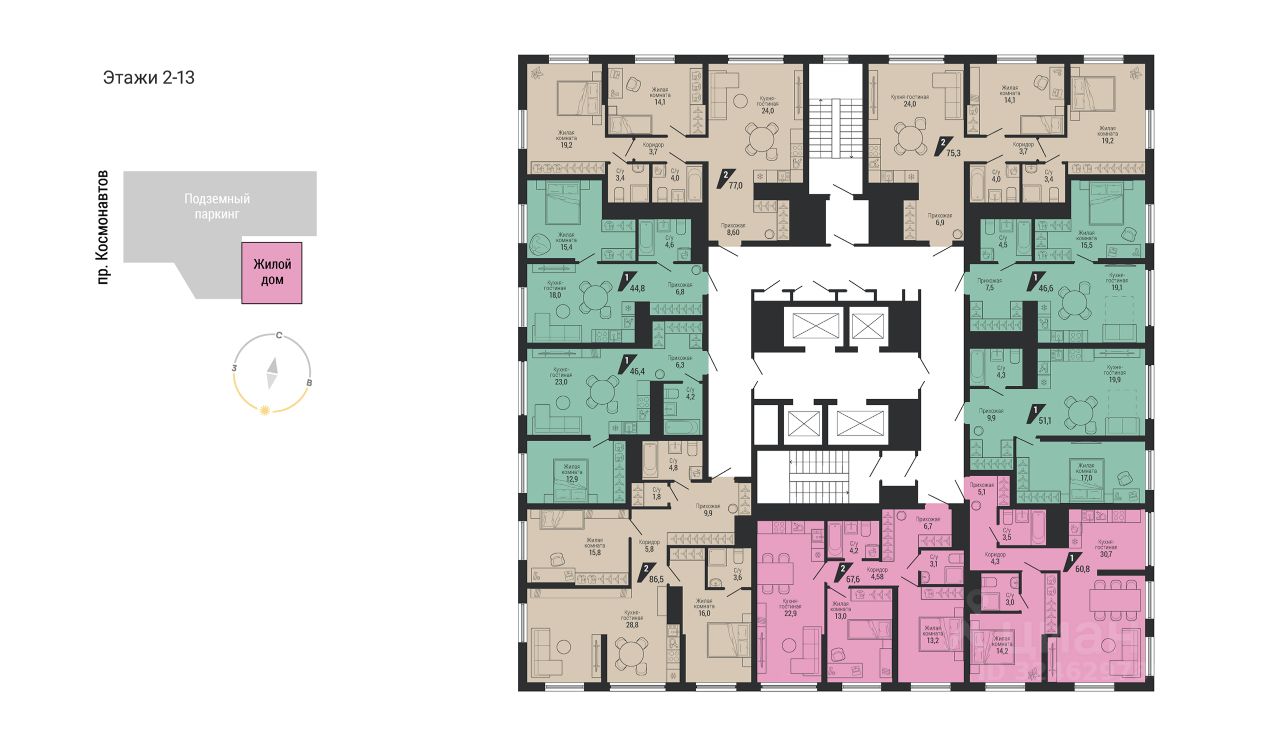Расположение усиливает ценность проекта: метро ''Проспект Космонавтов'' в 10 минутах пешком, детский сад в соседнем дворе, школа через дорогу, торговые центры и сосновый бор в шаговой доступности. До центра города 20 минут на автомобиле, выезд на ЕКАД всего за 7 минут.