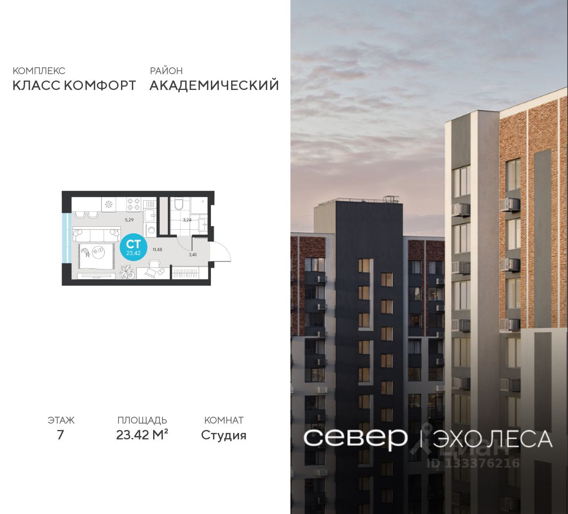 Продаётся квартира площадью 23.42 м2 в жилом комплексе ''Эхо леса''. Квартира находится на 7 этаже, жилая площадь квартиры 11.48 м2, площадь кухни-ниши — 5.29 м2.