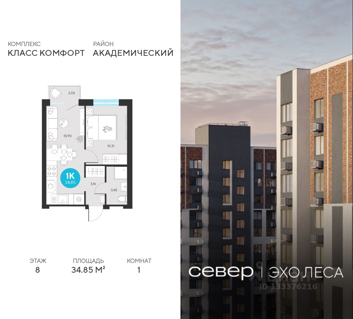 Продаётся квартира площадью 34.85 м2 в жилом комплексе ''Эхо леса''. Квартира находится на 8 этаже, жилая площадь квартиры 10.31 м2, площадь просторной кухни — 15.9 м2. Среди особенностей планировки — изолированные комнаты с окнами на одну сторону, 1 совмещённый санузел.
