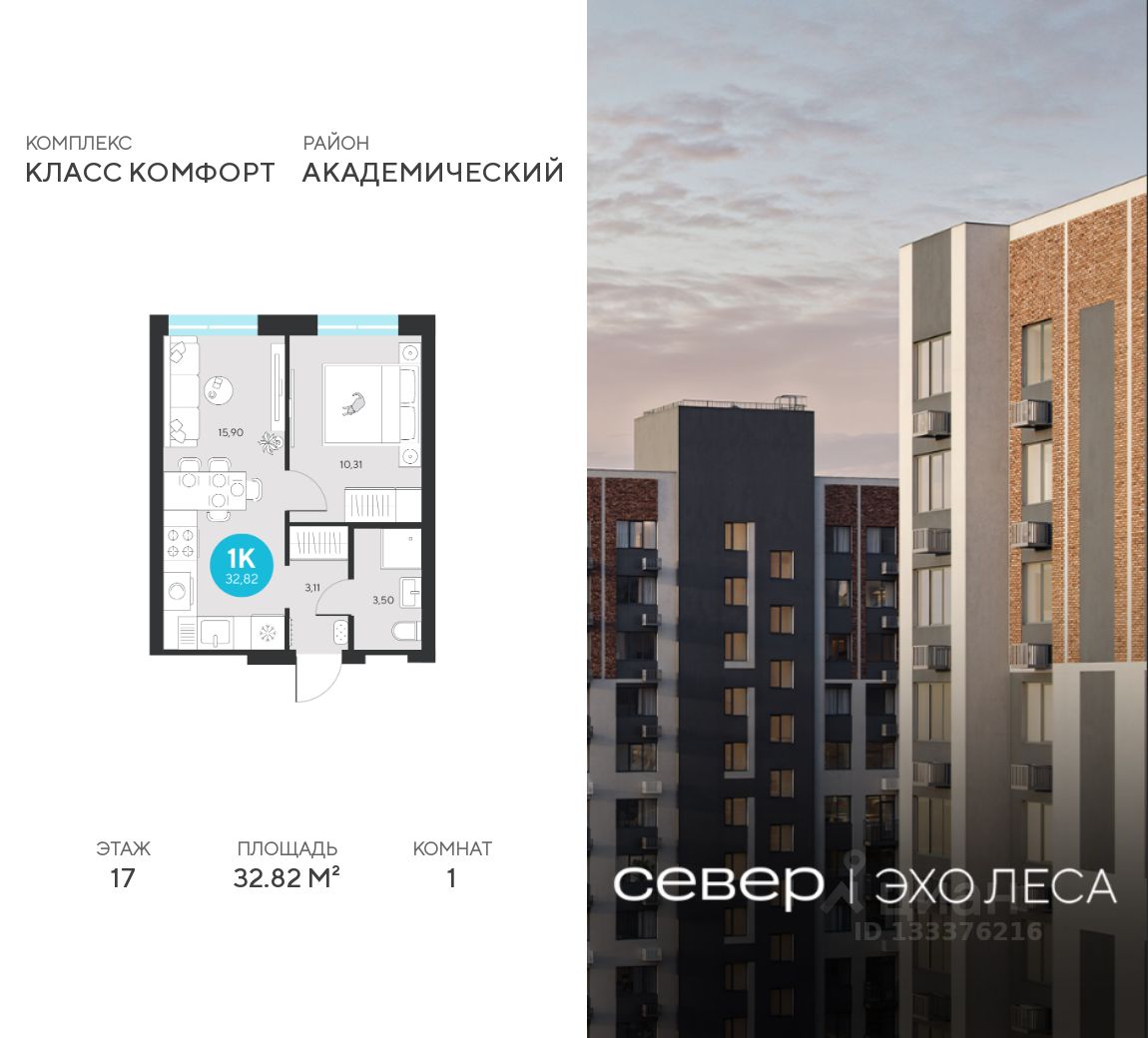 Продаётся квартира площадью 32.82 м2 в жилом комплексе ''Эхо леса''. Квартира находится на 17 этаже, жилая площадь квартиры 10.31 м2, площадь просторной кухни — 15.9 м2. Среди особенностей планировки — изолированные комнаты с окнами на одну сторону, 1 совмещённый санузел.