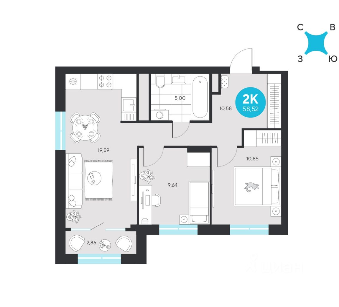 Продаётся квартира площадью 58.52 м2 в жилом комплексе ''Эхо леса''. Квартира находится на 19 этаже, жилая площадь квартиры 20.49 м2, площадь просторной кухни — 19.59 м2. Среди особенностей планировки — изолированные комнаты с окнами на одну сторону, 1 совмещённый санузел.