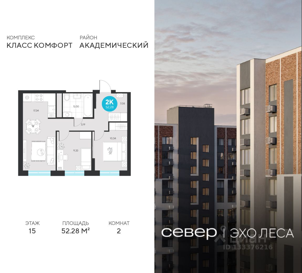 Продаётся квартира площадью 52.28 м2 в жилом комплексе ''Эхо леса''. Квартира находится на 15 этаже, жилая площадь квартиры 19.67 м2, площадь просторной кухни — 17.34 м2. Среди особенностей планировки — изолированные комнаты с окнами на одну сторону, 1 совмещённый санузел.