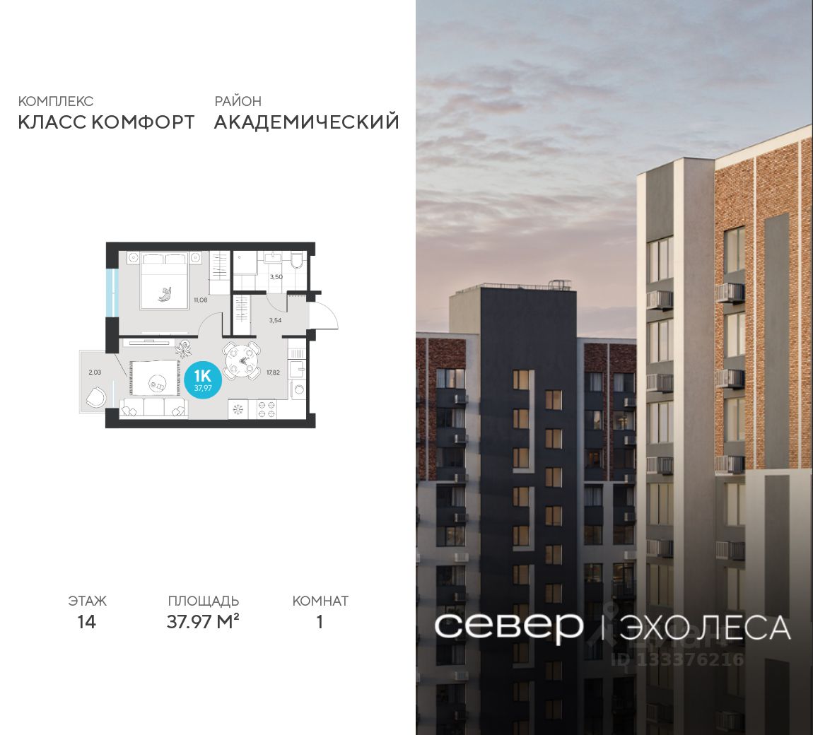 Продаётся квартира площадью 37.97 м2 в жилом комплексе ''Эхо леса''. Квартира находится на 14 этаже, жилая площадь квартиры 11.08 м2, площадь просторной кухни — 17.82 м2. Среди особенностей планировки — изолированные комнаты с окнами на одну сторону, 1 совмещённый санузел.