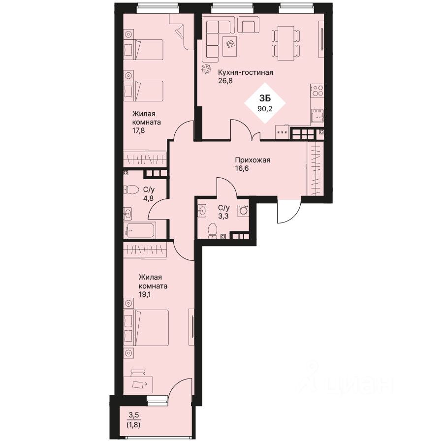 Общая площадь90,15 м2